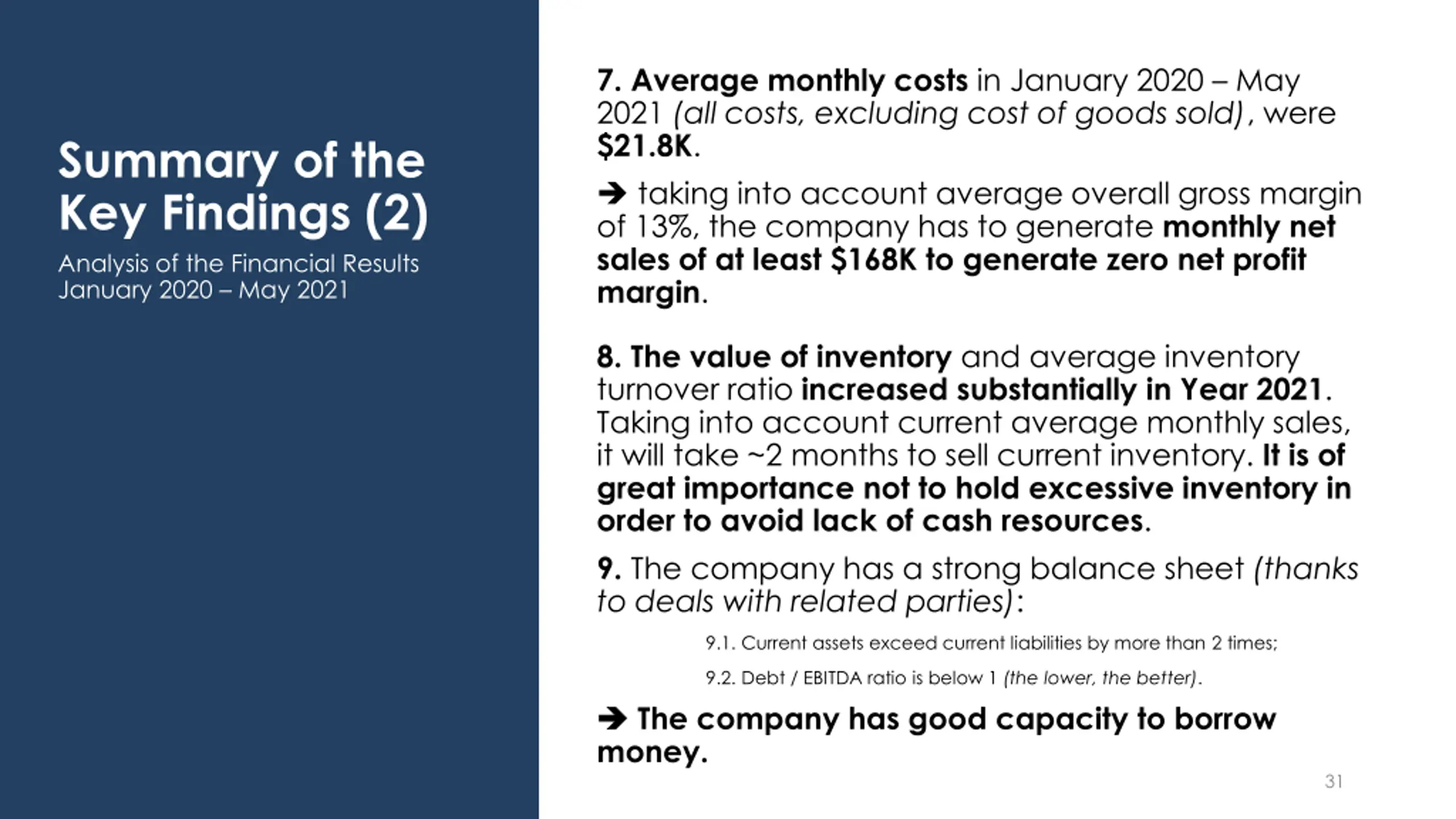 7. Average monthly costs in January 2020 May 2021 (all costs, excluding cost of goods sold), were $21.8K. taking into account average overall gross margin of 13%, the company has to generate monthly net sales of at least $168K to generate zero net profit margin. Summary of the Key Findings (2) Analysis of the Financial Results January 2020 May 2021 8. The value of inventory and average inventory turnover ratio increased substantially in Year 2021. Taking into account current average monthly sales, it will take ~2 months to sell current inventory. It is of great importance not to hold excessive inventory in order to avoid lack of cash resources. 9. The company has a strong balance sheet (thanks to deals with related parties): 9.1. Current assets exceed current liabilities by more than 2 times; 9.2. Debt / EBITDA ratio is below 1 (the lower, the better). The company has good capacity to borrow money. 31