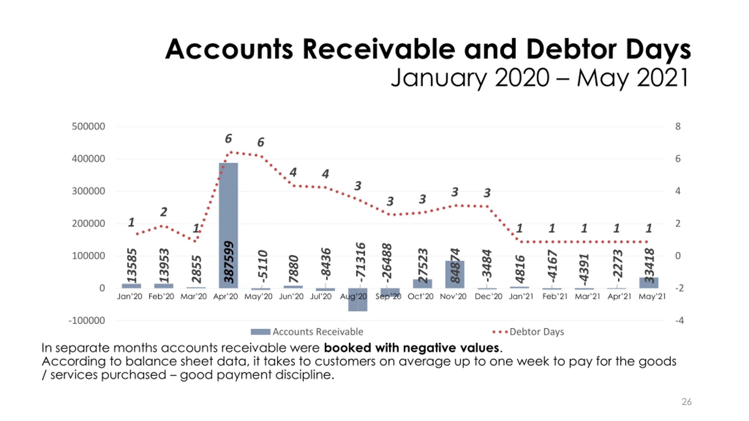 Accounts Receivable and Debtor Days January 2020 May 2021 500000 8 6 6 400000 6 4 4 3 3 300000 4 3 3 3 2 1 200000 2 1 1 1 1 1 1 387599 -71316 -26488 -8436 13953 13585 27523 84874 33418 -3484 -2273 -4167 -5110 100000 0 -4391 2855 7880 4816 0 -2 Jan 20 Feb 20 Mar 20 Apr 20 May 20 Jun 20 Jul 20 Aug 20 Sep 20 Oct 20 Nov 20 Dec 20 Jan 21 Feb 21 Mar 21 Apr 21 May 21 -100000 -4 Accounts Receivable Debtor Days In separate months accounts receivable were booked with negative values. According to balance sheet data, it takes to customers on average up to one week to pay for the goods / services purchased good payment discipline. 26