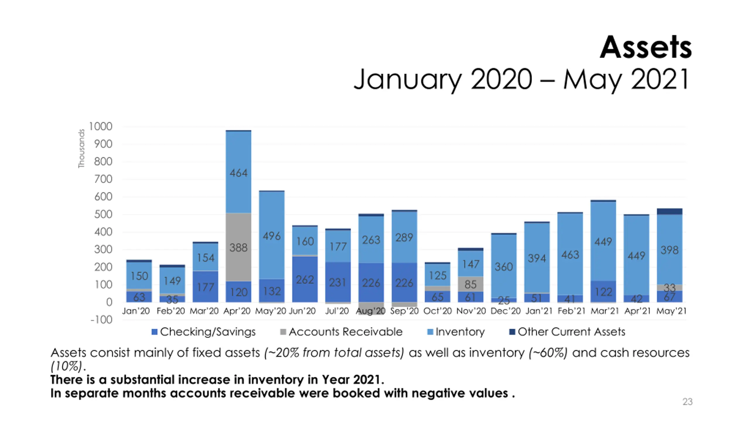 Assets January 2020 May 2021 1000 Thousands 900 800 464 700 600 500 400 496 289 263 160 449 177 388 300 398 463 449 154 394 147 360 200 125 150 262 149 231 226 226 100 85 177 33 132 122 120 67 65 63 61 51 42 41 35 25 0 Jan 20 Feb 20 Mar 20 Apr 20 May 20 Jun 20 Jul 20 Aug 20 Sep 20 Oct 20 Nov 20 Dec 20 Jan 21 Feb 21 Mar 21 Apr 21 May 21 -100 Checking/Savings Accounts Receivable Inventory Other Current Assets Assets consist mainly of fixed assets (~20% from total assets) as well as inventory (~60%) and cash resources (10%). There is a substantial increase in inventory in Year 2021. In separate months accounts receivable were booked with negative values . 23