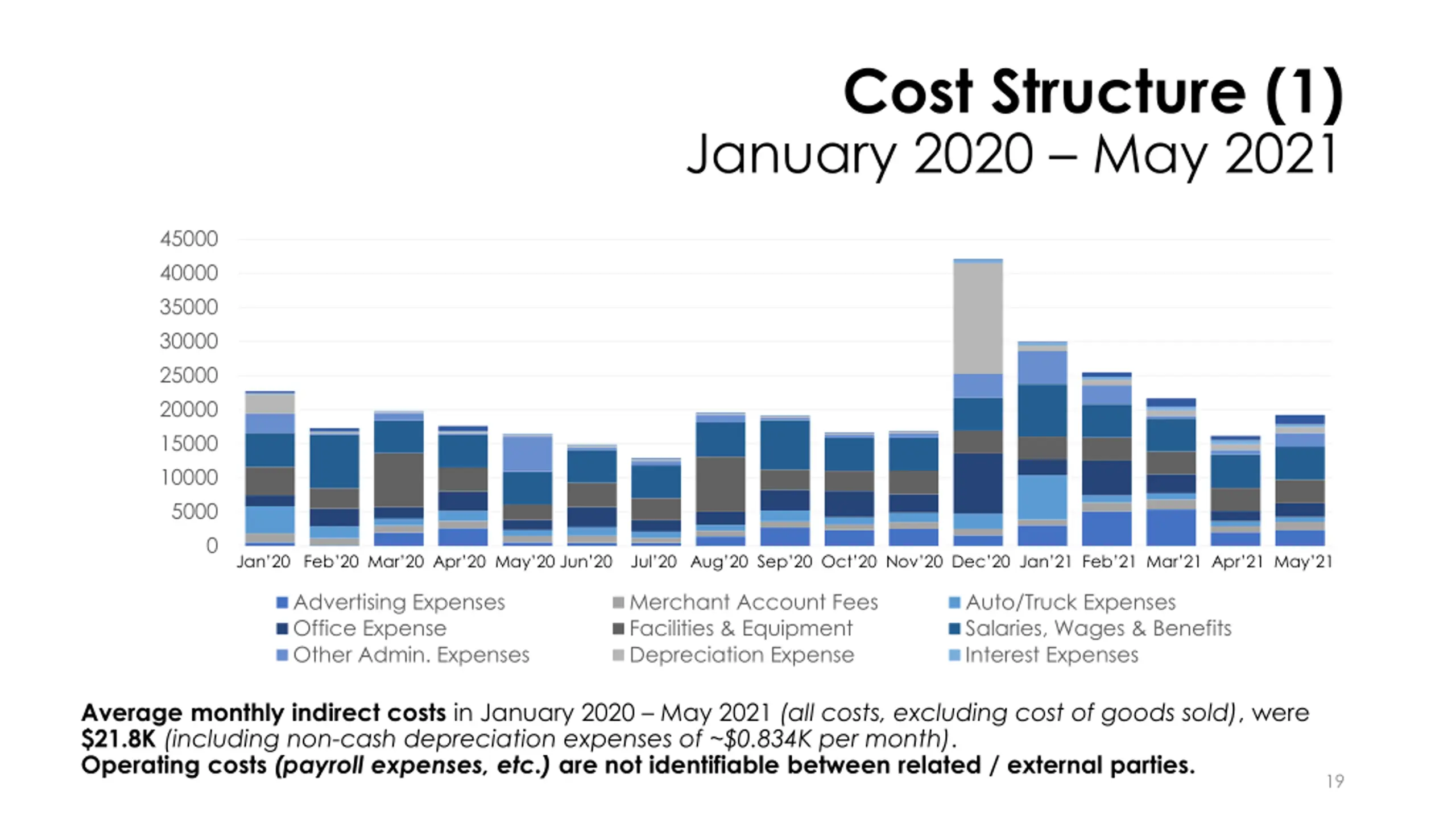 Cost Structure (1) January 2020 May 2021 45000 40000 35000 30000 25000 20000 15000 10000 5000 0 Jan 20 Feb 20 Mar 20 Apr 20 May 20 Jun 20 Jul 20 Aug 20 Sep 20 Oct 20 Nov 20 Dec 20 Jan 21 Feb 21 Mar 21 Apr 21 May 21 Advertising Expenses Office Expense Other Admin. Expenses Merchant Account Fees Facilities & Equipment Depreciation Expense Auto/Truck Expenses Salaries, Wages & Benefits Interest Expenses Average monthly indirect costs in January 2020 May 2021 (all costs, excluding cost of goods sold), were $21.8K(including non-cash depreciation expenses of ~$0.834K per month). Operating costs (payroll expenses, etc.) are not identifiable between related / external parties. 19