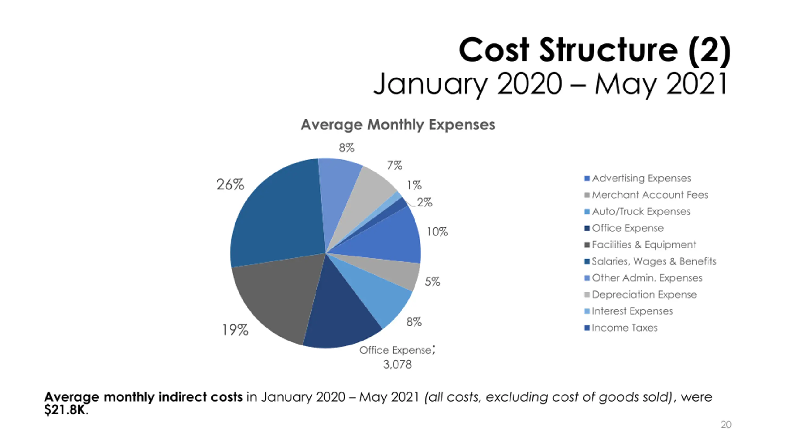 Cost Structure (2) January 2020 May 2021 Average Monthly Expenses 8% 7% Advertising Expenses Merchant Account Fees Auto/Truck Expenses Office Expense Facilities & Equipment Salaries, Wages & Benefits Other Admin. Expenses Depreciation Expense Interest Expenses Income Taxes 26% 1% 2% 10% 5% 8% 19% Office Expense; 3,078 Average monthly indirect costs in January 2020 May 2021 (all costs, excluding cost of goods sold), were $21.8K. 20