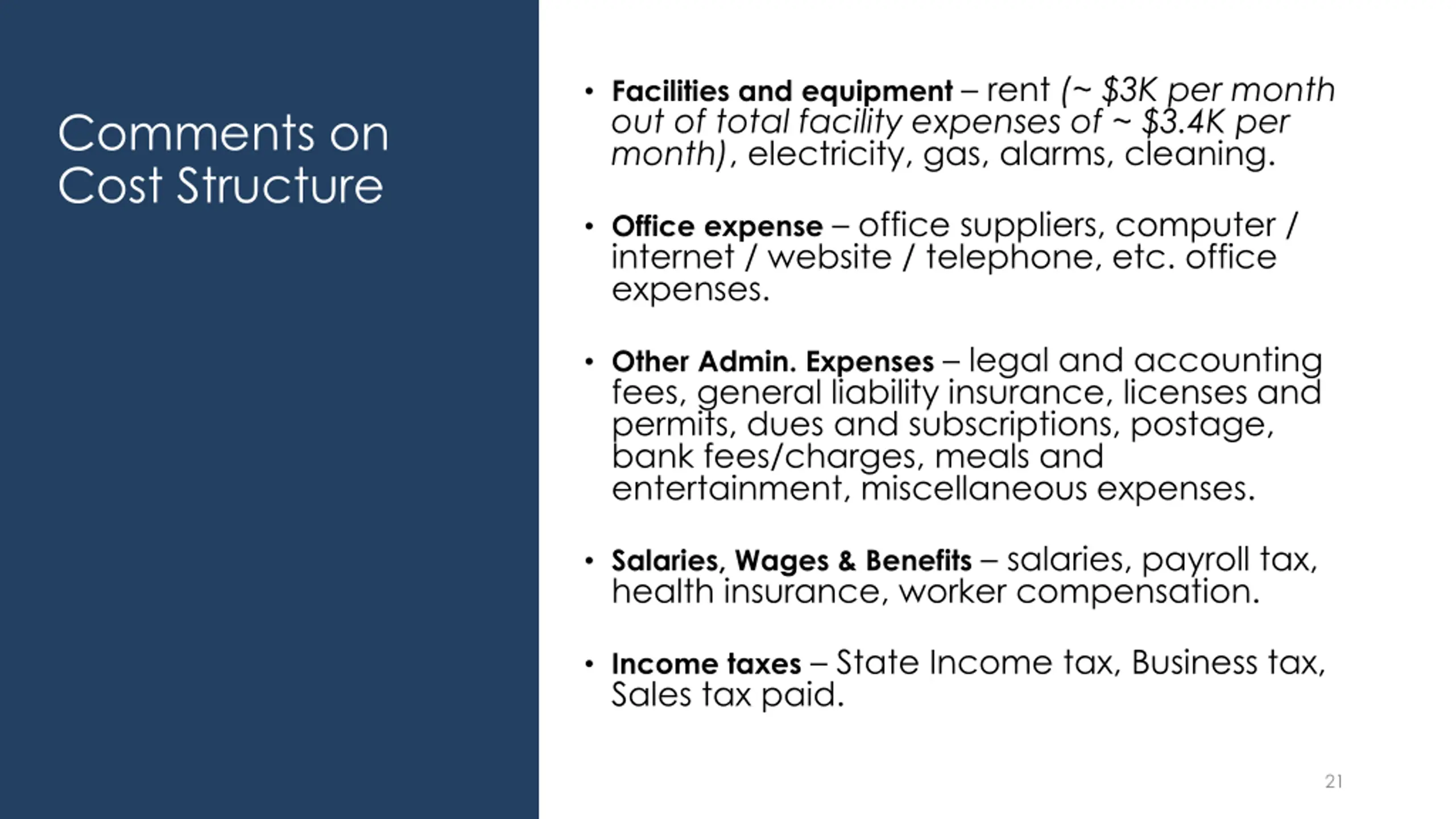 Facilities and equipment rent (~ $3K per month out of total facility expenses of ~ $3.4K per month), electricity, gas, alarms, cleaning. Comments on Cost Structure Office expense office suppliers, computer / internet / website / telephone, etc. office expenses. Other Admin. Expenses legal and accounting fees, general liability insurance, licenses and permits, dues and subscriptions, postage, bank fees/charges, meals and entertainment, miscellaneous expenses. Salaries, Wages & Benefits salaries, payroll tax, health insurance, worker compensation. Income taxes State Income tax, Business tax, Sales tax paid. 21