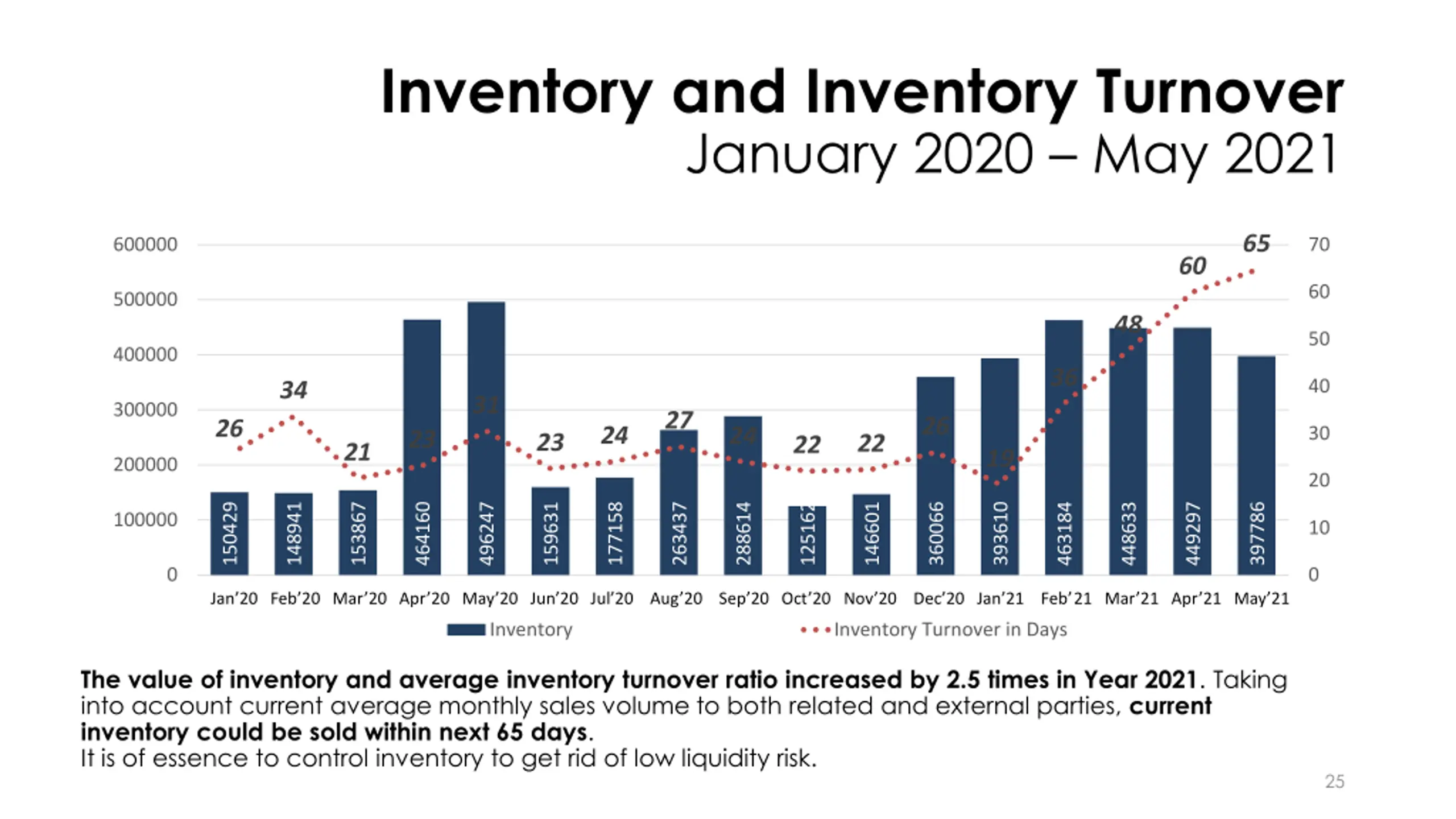 Inventory and Inventory Turnover January 2020 May 2021 65 600000 70 60 60 500000 48 50 400000 36 40 34 31 300000 27 26 26 24 24 30 23 23 22 22 21 19 200000 20 150429 148941 153867 464160 496247 159631 177158 263437 288614 125162 146601 360066 393610 463184 448633 449297 397786 100000 10 0 0 Jan 20 Feb 20 Mar 20 Apr 20 May 20 Jun 20 Jul 20 Aug 20 Sep 20 Oct 20 Nov 20 Dec 20 Jan 21 Feb 21 Mar 21 Apr 21 May 21 Inventory Inventory Turnover in Days The value of inventory and average inventory turnover ratioincreased by 2.5 times in Year 2021. Taking into account current average monthly sales volume to both related and external parties, current inventory could be sold within next 65 days. It is of essence to control inventory to get rid of low liquidity risk. 25