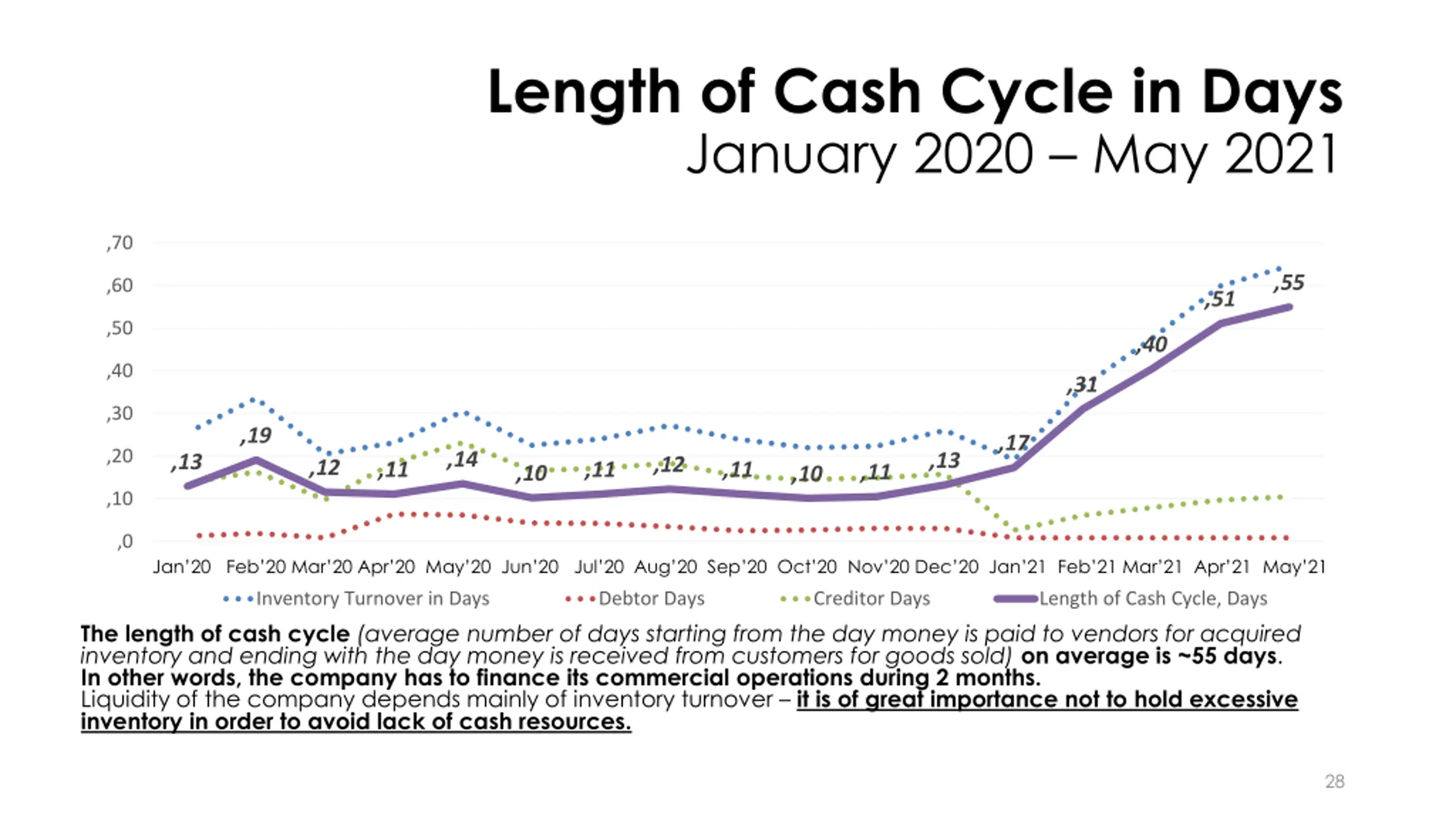 Length of Cash Cycle in Days January 2020 May 2021 ,70 ,55 ,60 ,51 ,50 ,40 ,40 ,31 ,30 ,19 ,17 ,20 ,14 ,13 ,13 ,12 ,12 ,11 ,11 ,11 ,11 ,10 ,10 ,10 ,0 Jan 20 Feb 20 Mar 20 Apr 20 May 20 Jun 20 Jul 20 Aug 20 Sep 20 Oct 20 Nov 20 Dec 20 Jan 21 Feb 21 Mar 21 Apr 21 May 21 Inventory Turnover in Days Debtor Days Creditor Days Length of Cash Cycle, Days The length of cash cycle (average number of days starting from the day money is paid to vendors for acquired inventory and ending with the day money is received from customers for goods sold)on average is ~55 days. In other words, the company has to finance its commercial operations during 2 months. Liquidity of the company depends mainly of inventory turnover it is of great importance not to hold excessive inventory in order to avoid lack of cash resources. 28