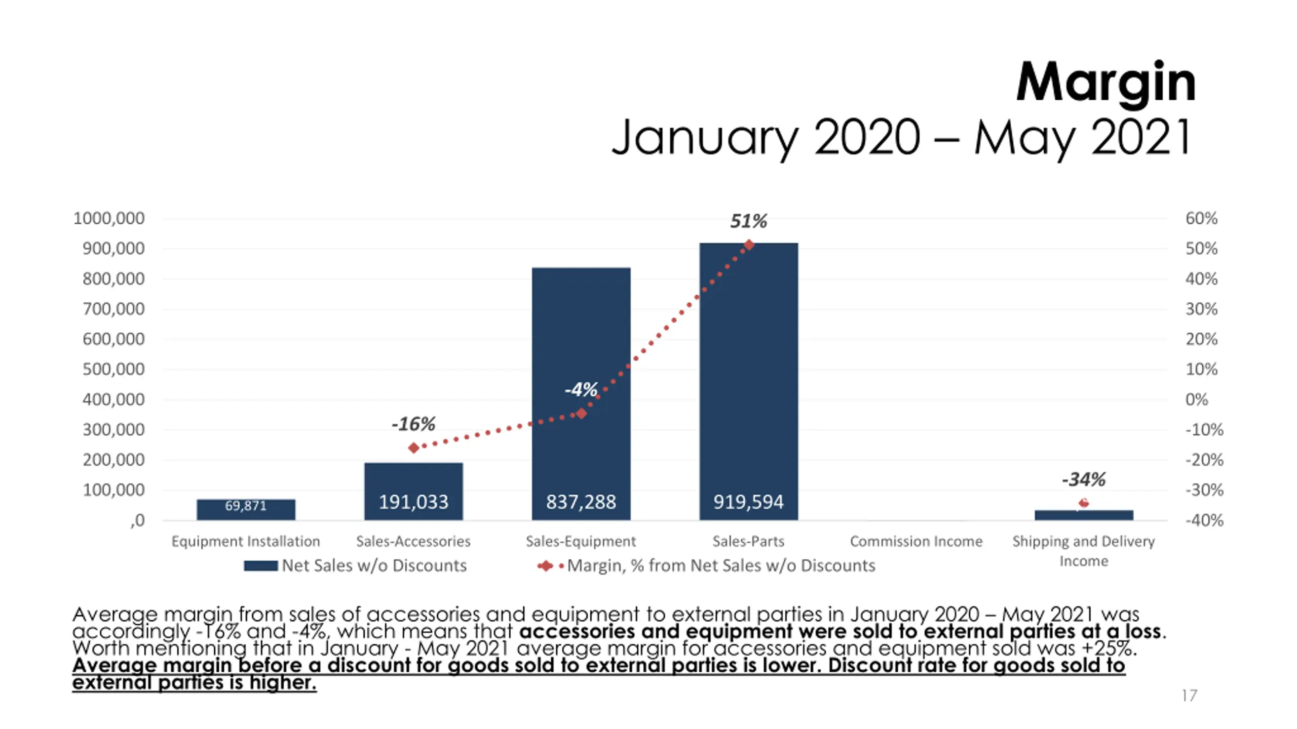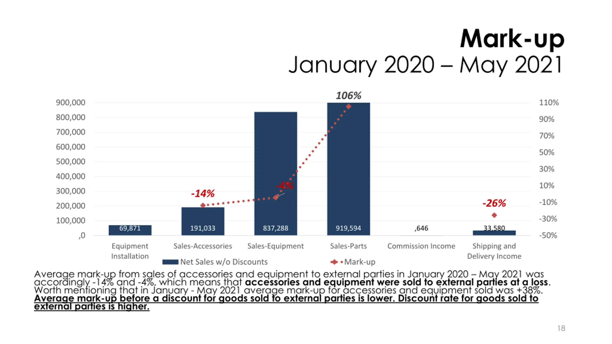 Margin January 2020 May 2021 1000,000 60% 51% 900,000 50% 800,000 40% 700,000 30% 600,000 20% 500,000 10% -4% 400,000 0% -16% 300,000 -10% 200,000 -20% -34% 100,000 -30% 191,033 837,288 919,594 ,646 33,580 69,871 ,0 -40% Equipment Installation Sales-Accessories Sales-Equipment Margin, % from Net Sales w/o Discounts Sales-Parts Commission Income Shipping and Delivery Income Net Sales w/o Discounts Average margin from sales of accessories and equipment to external parties in January 2020 May 2021 was accordingly -16% and -4%, which means that accessories and equipment were sold to external parties at a loss. Worth mentioning that in January - May 2021 average margin for accessories and equipment sold was +25%. Average margin before a discount for goods sold to external parties is lower. Discount rate for goods sold to external parties is higher. 17