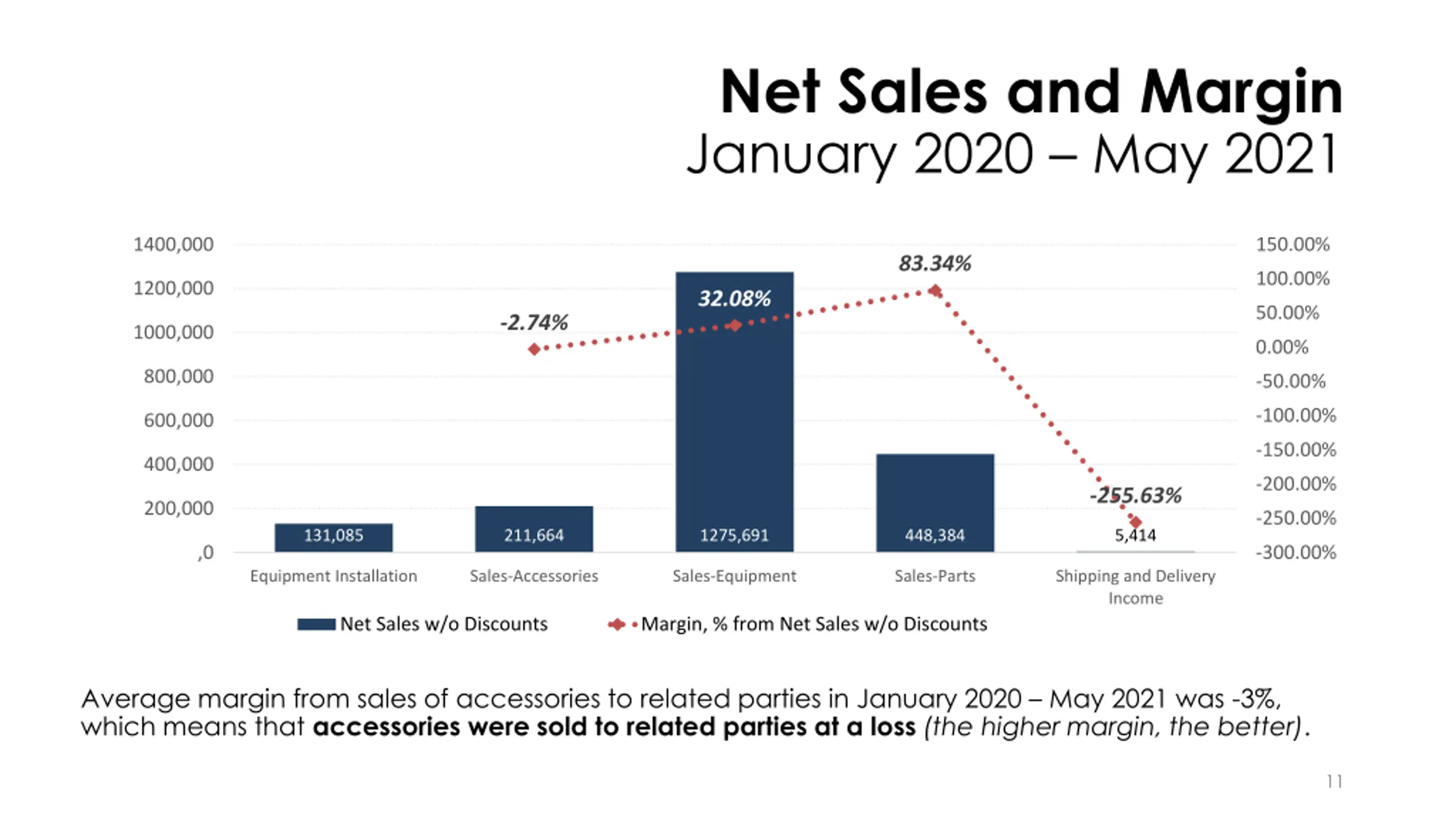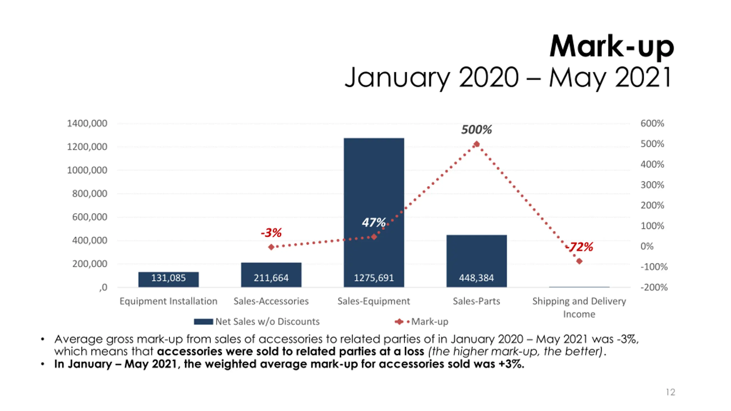 Mark-up January 2020 May 2021 1400,000 600% 500% 500% 1200,000 400% 1000,000 300% 800,000 200% 600,000 47% 100% -3% 400,000 -72% 0% 200,000 -100% 131,085 211,664 1275,691 448,384 5,414 ,0 -200% Equipment Installation Sales-Accessories Sales-Equipment Sales-Parts Shipping and Delivery Income Net Sales w/o Discounts Mark-up Average gross mark-up from sales of accessories to related parties of in January 2020 May 2021 was -3%, which means that accessories were sold to related parties at a loss (the higher mark-up, the better). In January May 2021, the weighted average mark-up for accessories sold was +3%. 12