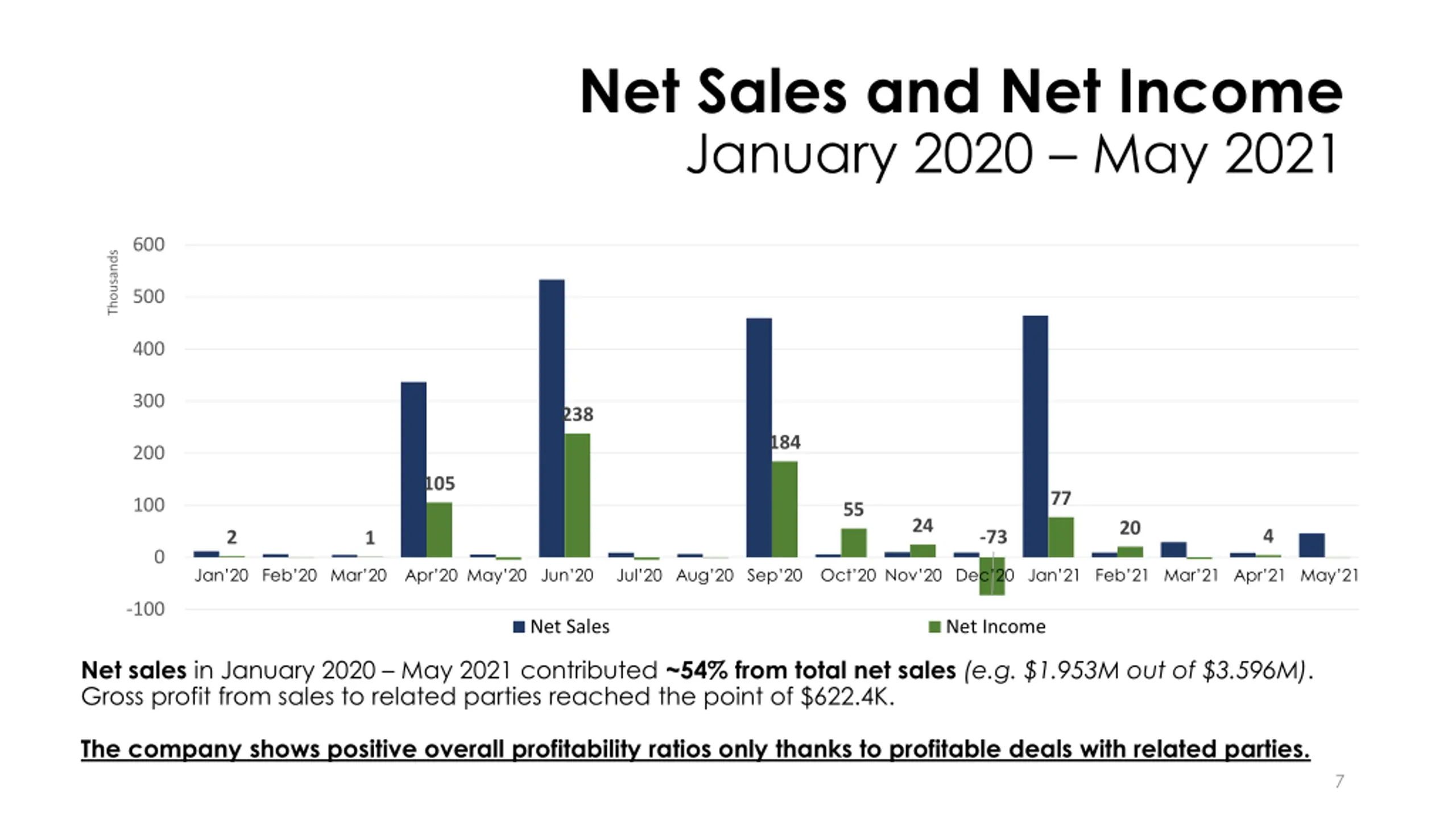 Net Sales and Net Income January 2020 May 2021 600 Thousands 500 400 300 238 184 200 105 77 100 55 24 20 4 -73 2 1 0 Jan 20 Feb 20 Mar 20 Apr 20 May 20 Jun 20 Jul 20 Aug 20 Sep 20 Oct 20 Nov 20 Dec 20 Jan 21 Feb 21 Mar 21 Apr 21 May 21 -100 Net Sales Net Income Net sales in January 2020 May 2021 contributed ~54% from total net sales(e.g. $1.953M out of $3.596M). Gross profit from sales to related parties reached the point of $622.4K. The company shows positive overall profitability ratios only thanks to profitable deals with related parties. 7