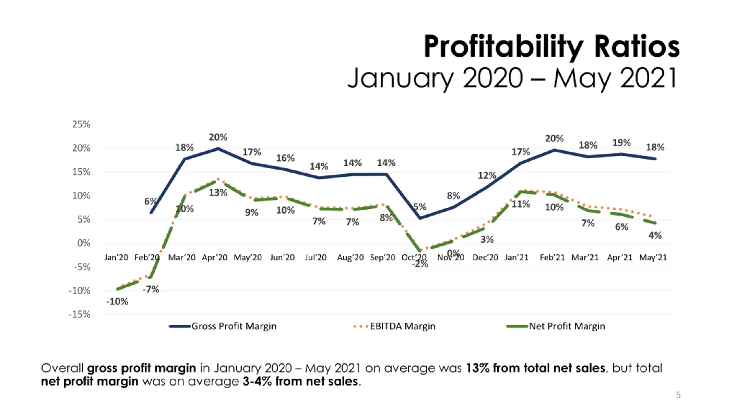 Profitability Ratios January 2020 May 2021 25% 20% 20% 19% 18% 18% 18% 20% 17% 17% 16% 14% 14% 14% 15% 12% 13% 10% 8% 6% 11% 5% 10% 10% 10% 9% 8% 5% 7% 7% 7% 6% 4% 3% 0% 0% Jan 20 Feb 20 Mar 20 Apr 20 May 20 Jun 20 Jul 20 Aug 20 Sep 20 Oct 20 Nov 20 Dec 20 Jan 21 Feb 21 Mar 21 Apr 21 May 21 -2% -5% -7% -10% -10% -15% Gross Profit Margin EBITDA Margin Net Profit Margin Overall gross profit margin in January 2020 May 2021 on average was 13% from total net sales, but total net profit margin was on average 3-4% from net sales. 5