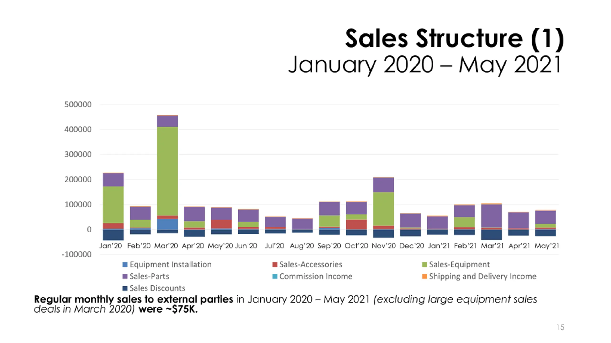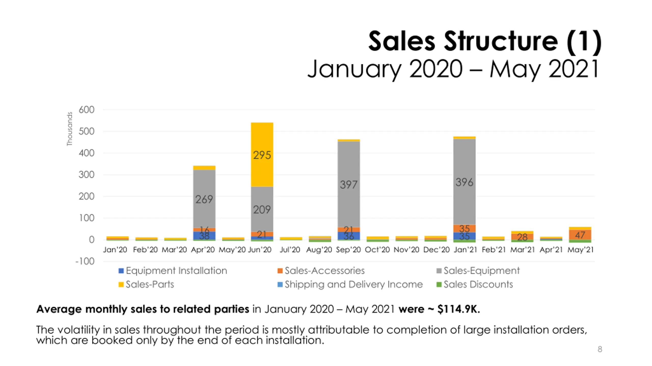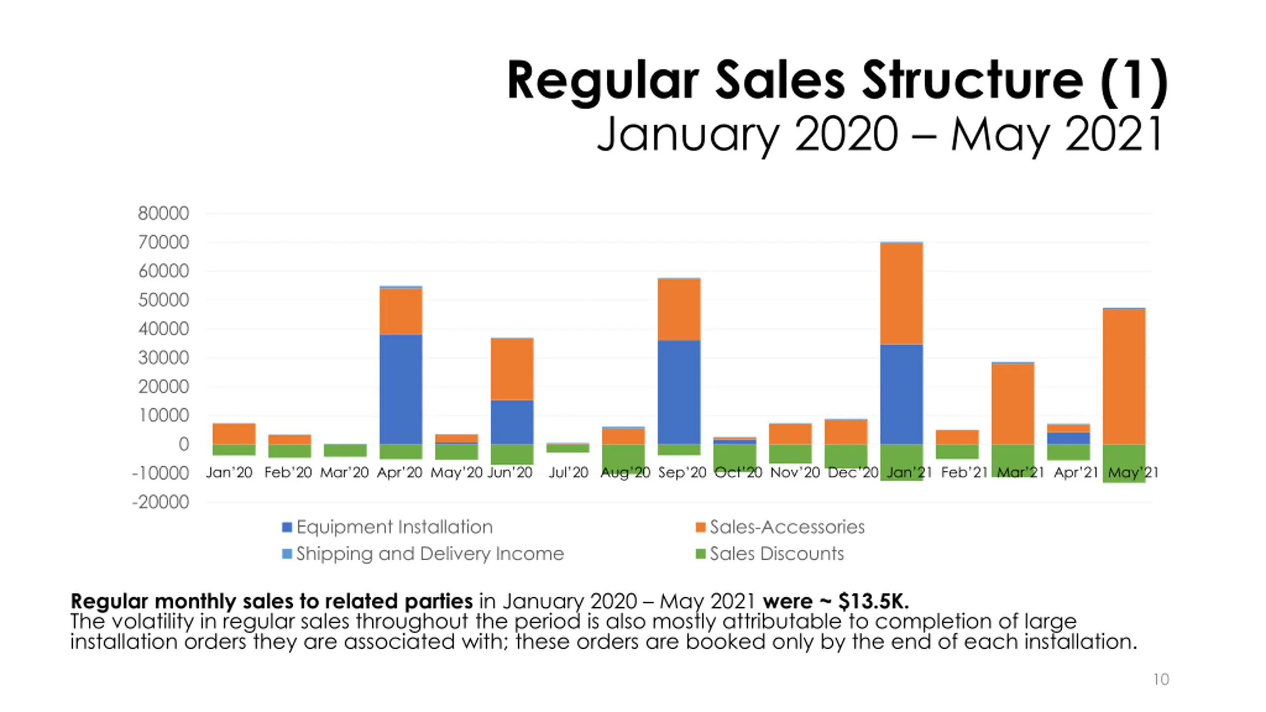 Regular Sales Structure (1) January 2020 May 2021 80000 70000 60000 50000 40000 30000 20000 10000 0 -10000 Jan 20 Feb 20 Mar 20 Apr 20 May 20 Jun 20 Jul 20 Aug 20 Sep 20 Oct 20 Nov 20 Dec 20 Jan 21 Feb 21 Mar 21 Apr 21 May 21 -20000 Equipment Installation Shipping and Delivery Income Sales-Accessories Sales Discounts Regular monthly sales to related parties in January 2020 May 2021 were ~ $13.5K. The volatility in regular sales throughout the period is also mostly attributable to completion of large installation orders they are associated with; these orders are booked only by the end of each installation. 10