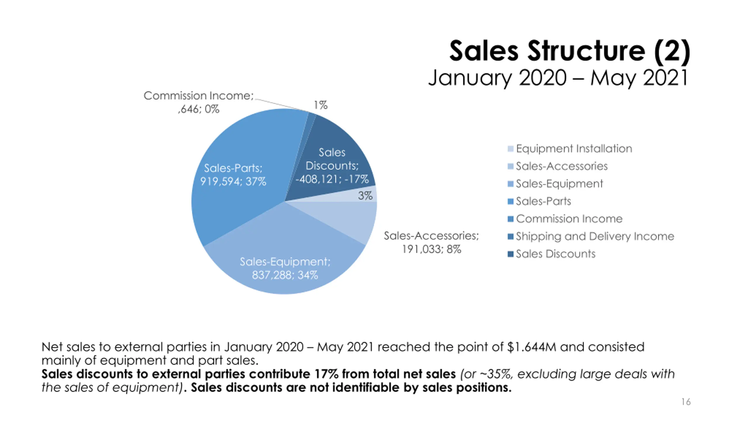 Sales Structure (2) January 2020 May 2021 Commission Income; ,646; 0% 1% Equipment Installation Sales-Accessories Sales-Equipment Sales-Parts Commission Income Shipping and Delivery Income Sales Discounts Sales Discounts; -408,121; -17% Sales-Parts; 919,594; 37% 3% Sales-Accessories; 191,033; 8% Sales-Equipment; 837,288; 34% Net sales to external parties in January 2020 May 2021 reached the point of $1.644M and consisted mainly of equipment and part sales. Sales discounts to external parties contribute 17% from total net sales (or ~35%, excluding large deals with the sales of equipment). Sales discounts are not identifiable by sales positions. 16