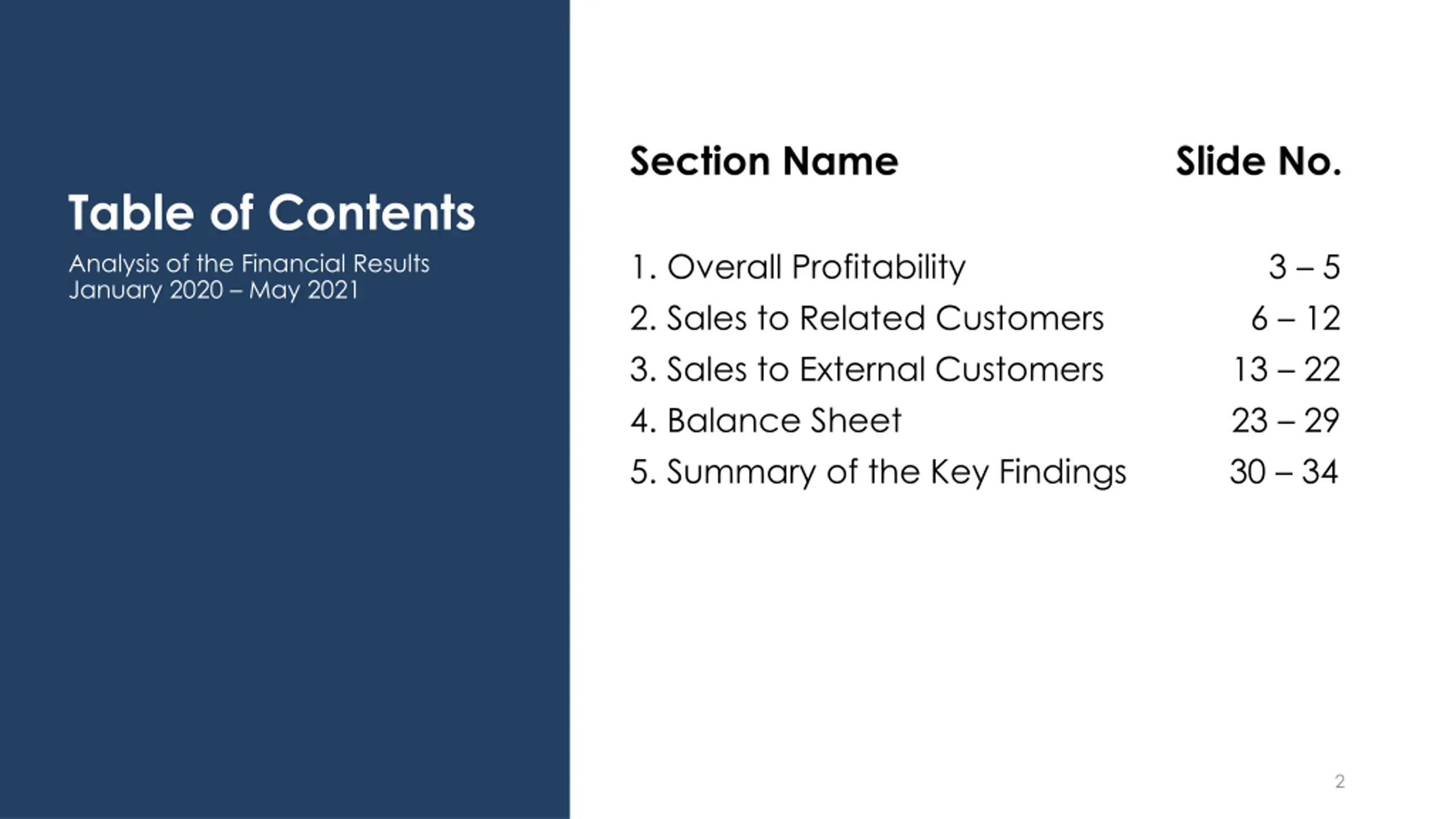 Section Name Slide No. Table of Contents Analysis of the Financial Results January 2020 May 2021 1. Overall Profitability 2. Sales to Related Customers 3. Sales to External Customers 4. Balance Sheet 5. Summary of the Key Findings 3 5 6 12 13 22 23 29 30 34 2