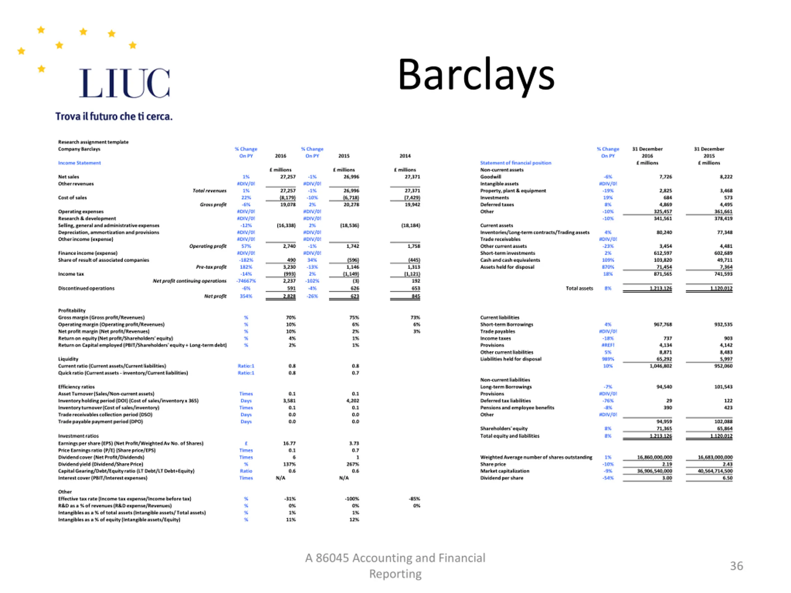 Barclays Research assignment template Company Barclays % Change On PY % Change On PY % Change On PY 31 December 2016 millions 31 December 2015 millions 2016 2015 2014 Income Statement Statement of financial position Non-current assets Goodwill Intangible assets Property, plant & equipment Investments Deferred taxes Other millions 27,257 millions 26,996 millions 27,371 Net sales Other revenues 1% -1% -6% 7,726 8,222 #DIV/0! 1% 22% -6% #DIV/0! #DIV/0! -12% #DIV/0! #DIV/0! 57% #DIV/0! -182% 182% -14% -74667% -6% 354% #DIV/0! -1% -10% 2% #DIV/0! #DIV/0! 2% #DIV/0! #DIV/0! -1% #DIV/0! 34% -13% 2% -102% -4% -26% #DIV/0! -19% 19% 8% -10% -10% Total revenues 27,257 (8,179) 19,078 26,996 (6,718) 20,278 27,371 (7,429) 19,942 2,825 684 4,869 325,457 341,561 3,468 573 4,495 361,661 378,419 Cost of sales Gross profit Operating expenses Research & development Selling, general and administrative expenses Depreciation, ammortization and provisions Other income (expense) (16,338) (18,536) (18,184) Current assets Inventories/Long-term contracts/Trading assets Trade receivables Other current assets Short-term investments Cash and cash equivalents Assets held for disposal 4% 80,240 77,348 #DIV/0! -23% 2% 109% 870% 18% Operating profit 2,740 1,742 1,758 3,454 612,597 103,820 71,454 871,565 4,481 602,689 49,711 7,364 741,593 Finance income (expense) Share of result of associated companies 490 (596) 1,146 (1,149) (445) 1,313 (1,121) 192 653 845 Pre-tax profit 3,230 (993) 2,237 591 2,828 Income tax Net profit continuing operations (3) 626 623 Discontinued operations Total assets 8% 1,213,126 1,120,012 Net profit Profitability Gross margin (Gross profit/Revenues) Operating margin (Operating profit/Revenues) Net profit margin (Net profit/Revenues) Return on equity (Net profit/Shareholders' equity) Return on Capital employed (PBIT/Shareholders' equity + Long-term debt) % % % % % 70% 10% 10% 4% 2% 75% 6% 2% 1% 1% 73% 6% 3% Current liabilities Short-term Borrowings Trade payables Income taxes Provisions Other current liabilities Liabilities held for disposal 4% 967,768 932,535 #DIV/0! -18% #REF! 5% 989% 10% 737 903 4,134 8,871 65,292 1,046,802 4,142 8,483 5,997 952,060 Liquidity Current ratio (Current assets/Current liabilities) Quick ratio (Current assets - inventory/Current liabilities) Ratio:1 Ratio:1 0.8 0.8 0.8 0.7 Non-current liabilities Long-term Borrowings Provisions Deferred tax liabilities Pensions and employee benefits Other Efficiency ratios Asset Turnover (Sales/Non-current assets) Inventory holding period (DOI) (Cost of sales/inventory x 365) Inventory turnover (Cost of sales/inventory) Trade receivables collection period (DSO) Trade payable payment period (DPO) -7% 94,540 101,543 Times Days Times Days Days 0.1 0.1 #DIV/0! -76% -8% #DIV/0! 3,581 0.1 0.0 0.0 4,202 0.1 0.0 0.0 29 390 122 423 94,959 71,365 1,213,126 102,088 65,864 1,120,012 Shareholders' equity Total equity and liabilities 8% 8% Investment ratios Earnings per share (EPS) (Net Profit/Weighted Av No. of Shares) Price Earnings ratio (P/E) (Share price/EPS) Dividend cover (Net Profit/Dividends) Dividend yield (Dividend/Share Price) Capital Gearing/Debt/Equity ratio (LT Debt/LT Debt+Equity) Interest cover (PBIT/Interest expenses) 16.77 0.1 3.73 0.7 Times Times % Ratio Times 6 1 Weighted Average number of shares outstanding Share price Market capitalization Dividend per share 1% -10% -9% -54% 16,860,000,000 16,683,000,000 137% 0.6 267% 0.6 2.19 2.43 36,906,540,000 40,564,714,500 N/A N/A 3.00 6.50 Other Effective tax rate (Income tax expense/Income before tax) R&D as a % of revenues (R&D expense/Revenues) Intangibles as a % of total assets (Intangible assets/ Total assets) Intangibles as a % of equity (Intangible assets/Equity) % % % % -31% 0% 1% 11% -100% -85% 0% 0% 1% 12% A 86045 Accounting and Financial Reporting 36