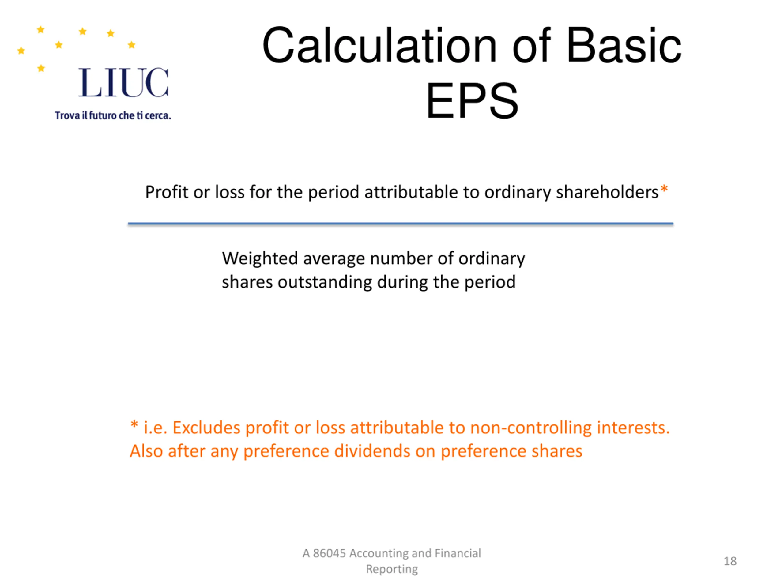 Significance of EPS EPS is widely used as a means of assessing a company's financial performance EPS feeds into the Price/Earnings ratio, which is an important indicator of investment potential EPS is the only ratio which is defined by an international standard (IAS33) A 86045 Accounting and Financial Reporting 16