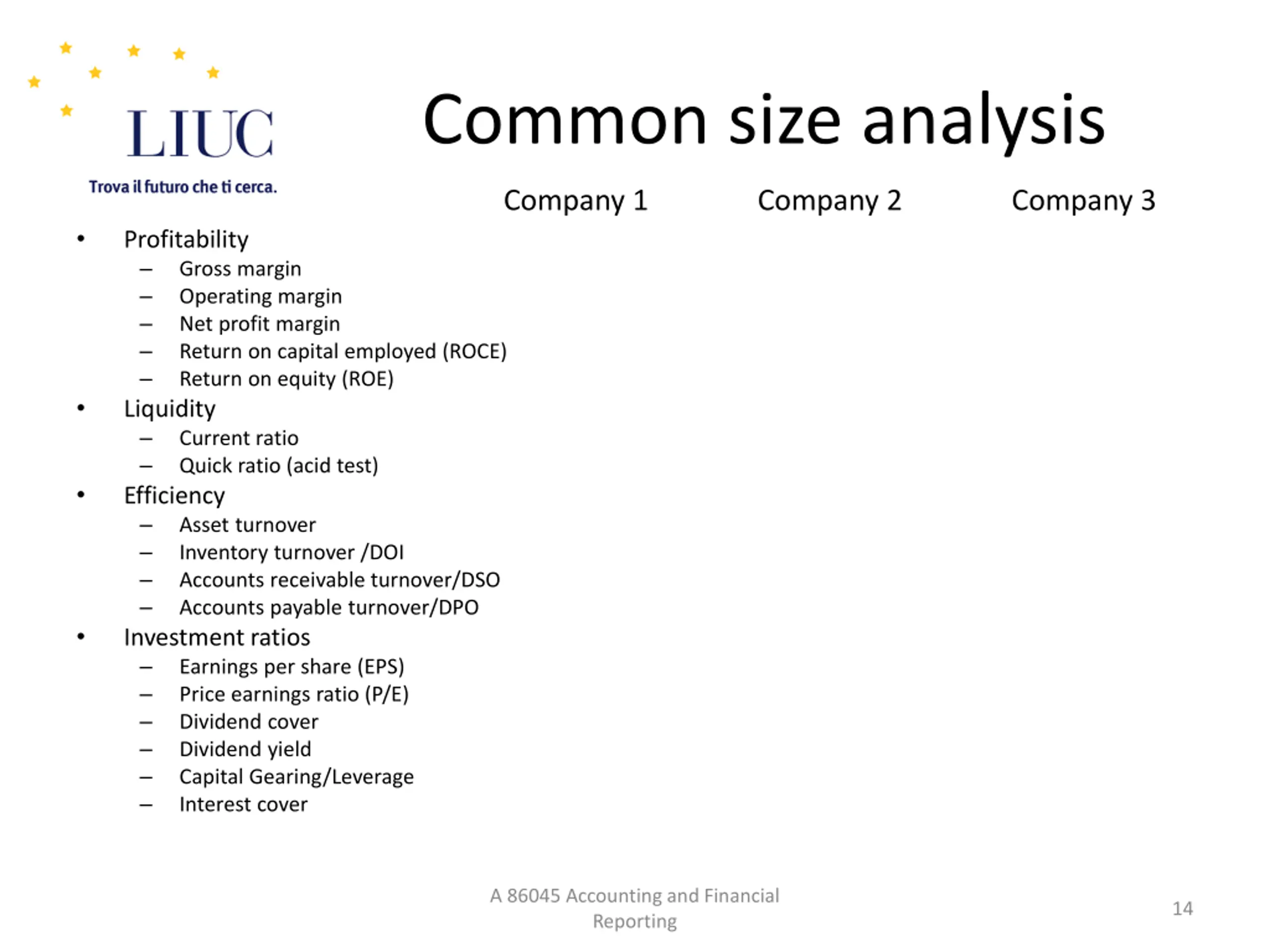 Common size analysis Company 1 Company 2 Company 3 Profitability Gross margin Operating margin Net profit margin Return on capital employed (ROCE) Return on equity (ROE) Liquidity Current ratio Quick ratio (acid test) Efficiency Asset turnover Inventory turnover /DOI Accounts receivable turnover/DSO Accounts payable turnover/DPO Investment ratios Earnings per share (EPS) Price earnings ratio (P/E) Dividend cover Dividend yield Capital Gearing/Leverage Interest cover A 86045 Accounting and Financial Reporting 14