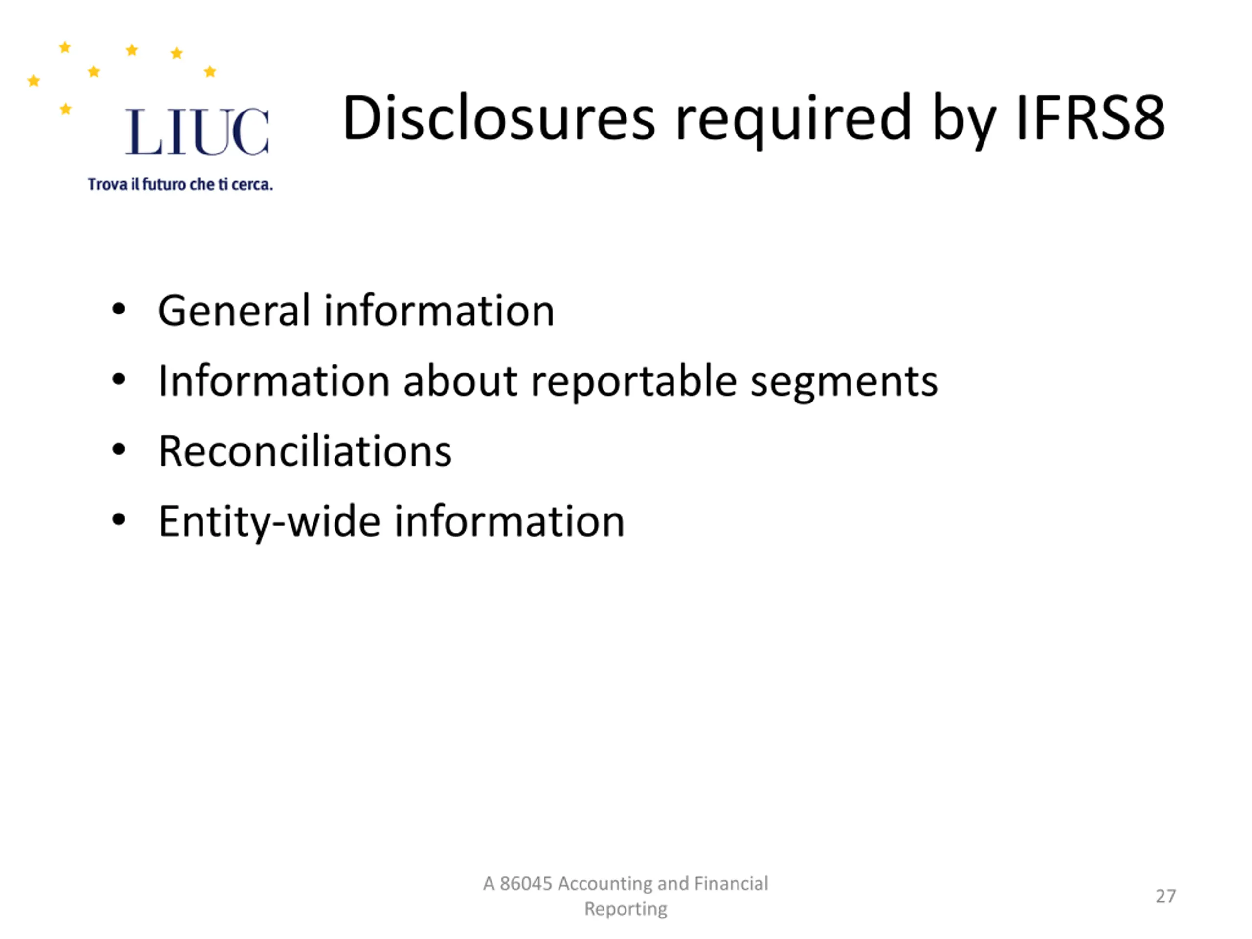 Disclosures required by IFRS8 General information Information about reportable segments Reconciliations Entity-wide information A 86045 Accounting and Financial Reporting 27
