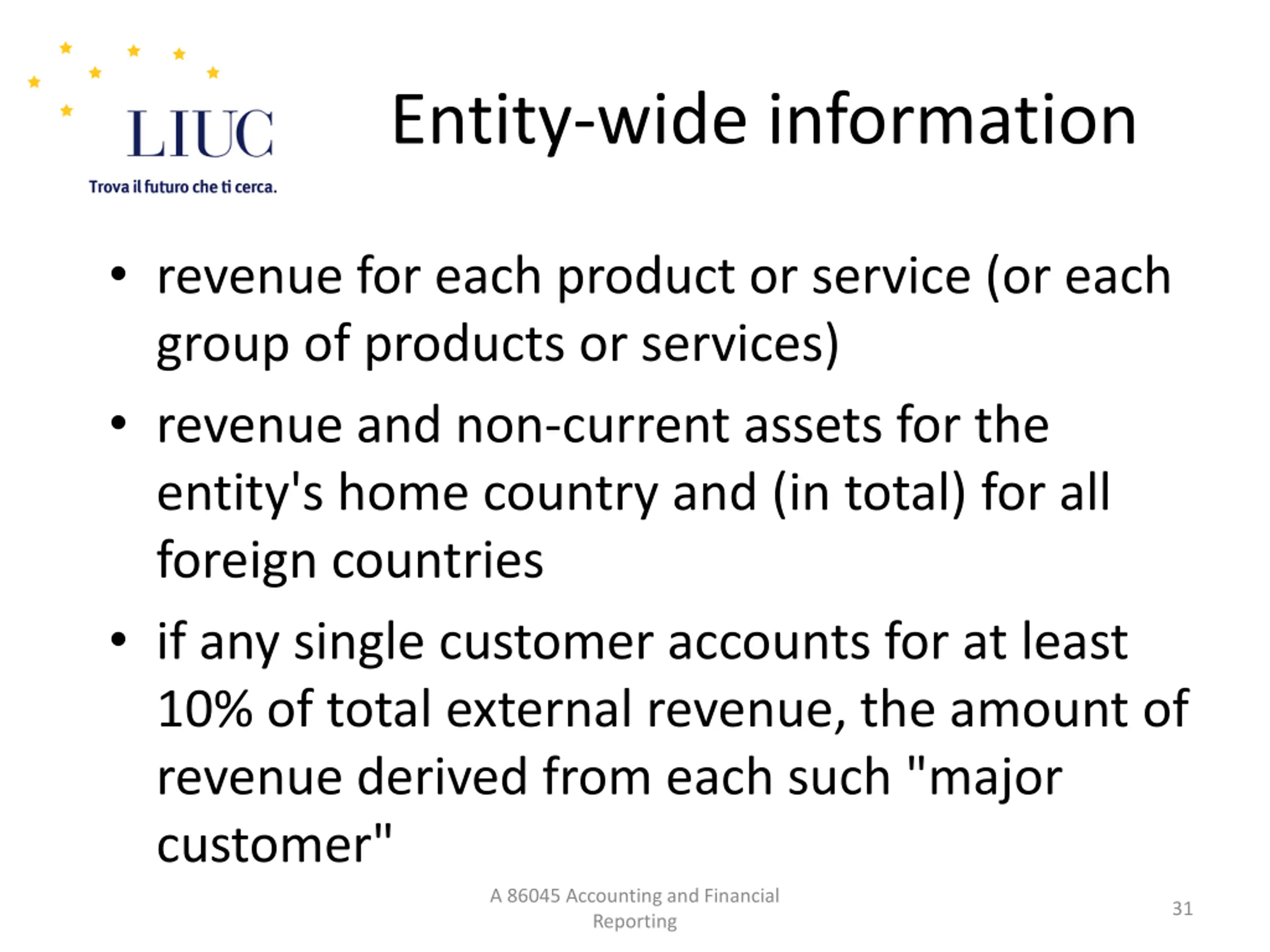 Entity-wide information revenue for each product or service (or each group of products or services) revenue and non-current assets for the entity's home country and (in total) for all foreign countries if any single customer accounts for at least 10% of total external revenue, the amount of revenue derived from each such "major customer" A 86045 Accounting and Financial Reporting 31