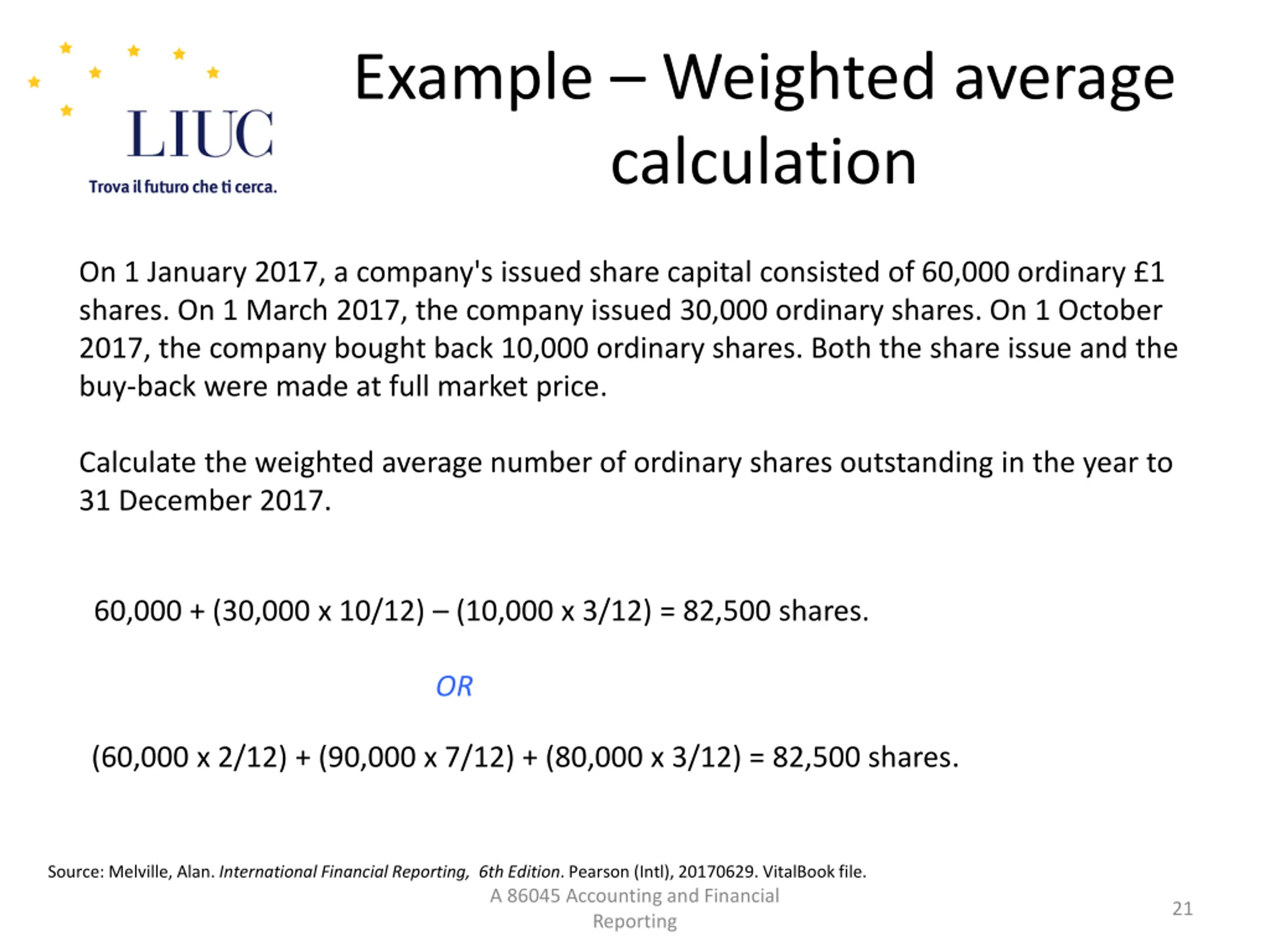 Example Weighted average calculation On 1 January 2017, a company's issued share capital consisted of 60,000 ordinary 1 shares. On 1 March 2017, the company issued 30,000 ordinary shares. On 1 October 2017, the company bought back 10,000 ordinary shares. Both the share issue and the buy-back were made at full market price. Calculate the weighted average number of ordinary shares outstanding in the year to 31 December 2017. 60,000 + (30,000 x 10/12) (10,000 x 3/12) = 82,500 shares. OR (60,000 x 2/12) + (90,000 x 7/12) + (80,000 x 3/12) = 82,500 shares. Source: Melville, Alan. International Financial Reporting, 6th Edition. Pearson (Intl), 20170629. VitalBook file. A 86045 Accounting and Financial Reporting 21