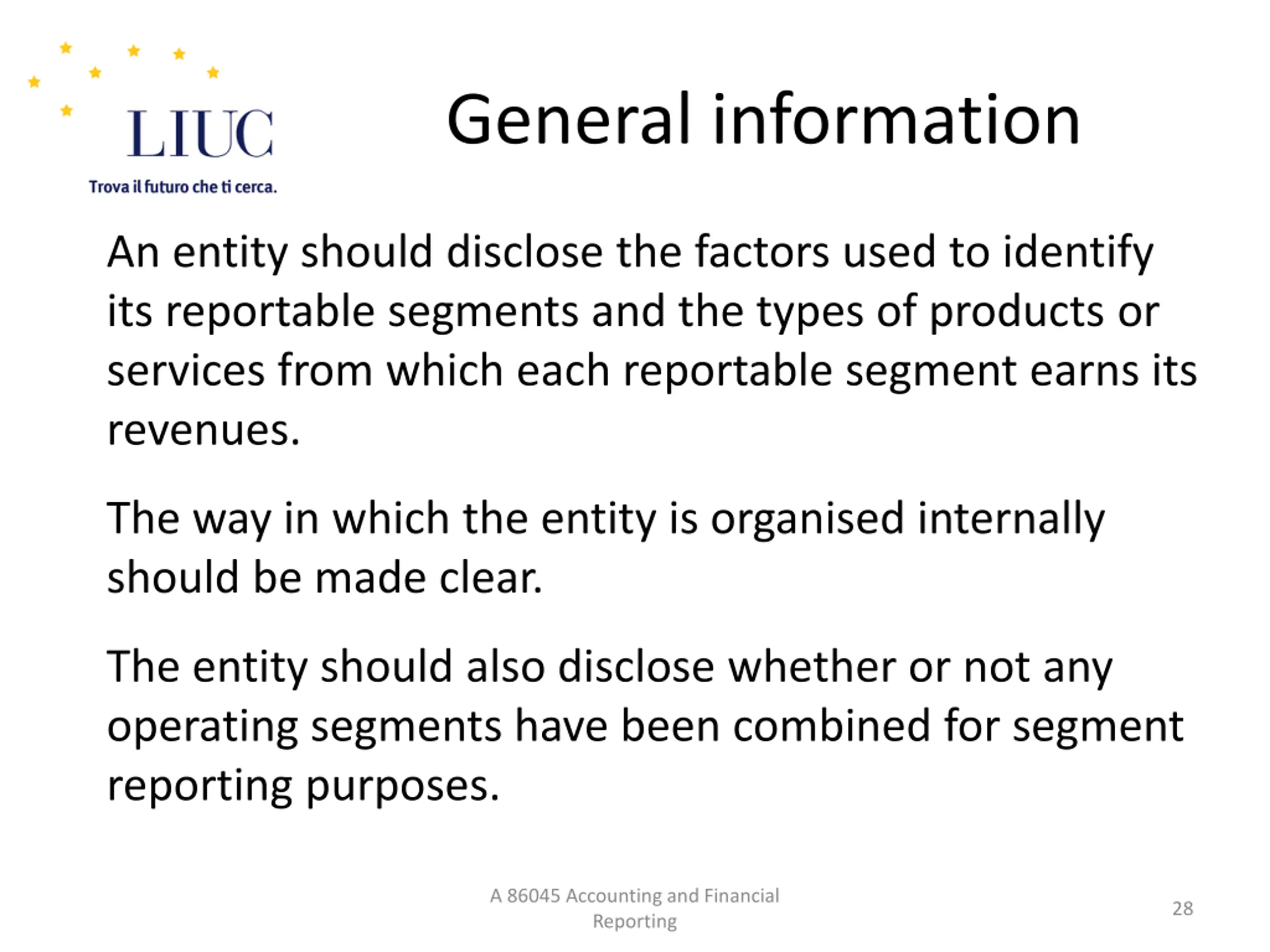 General information An entity should disclose the factors used to identify its reportable segments and the types of products or services from which each reportable segment earns its revenues. The way in which the entity is organised internally should be made clear. The entity should also disclose whether or not any operating segments have been combined for segment reporting purposes. A 86045 Accounting and Financial Reporting 28