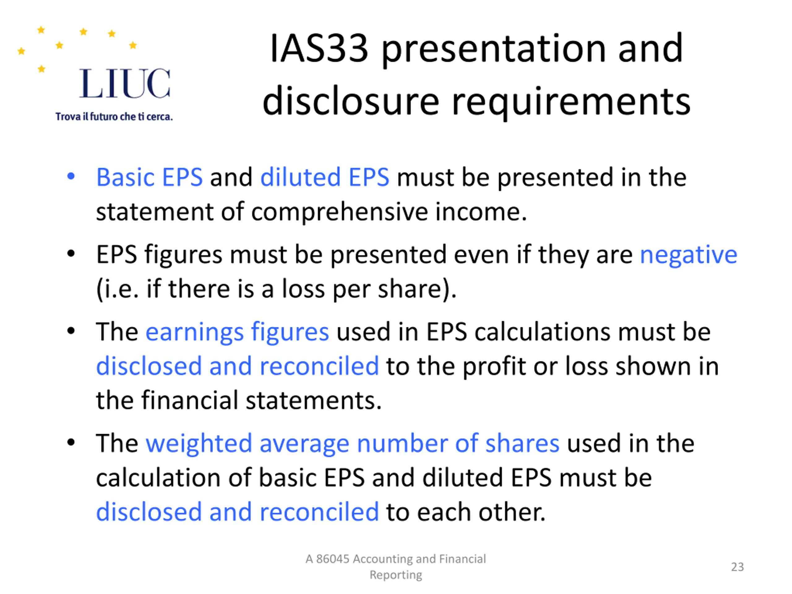 IAS33 presentation and disclosure requirements Basic EPS and diluted EPS must be presented in the statement of comprehensive income. EPS figures must be presented even if they are negative (i.e. if there is a loss per share). The earnings figures used in EPS calculations must be disclosed and reconciled to the profit or loss shown in the financial statements. The weighted average number of shares used in the calculation of basic EPS and diluted EPS must be disclosed and reconciled to each other. A 86045 Accounting and Financial Reporting 23