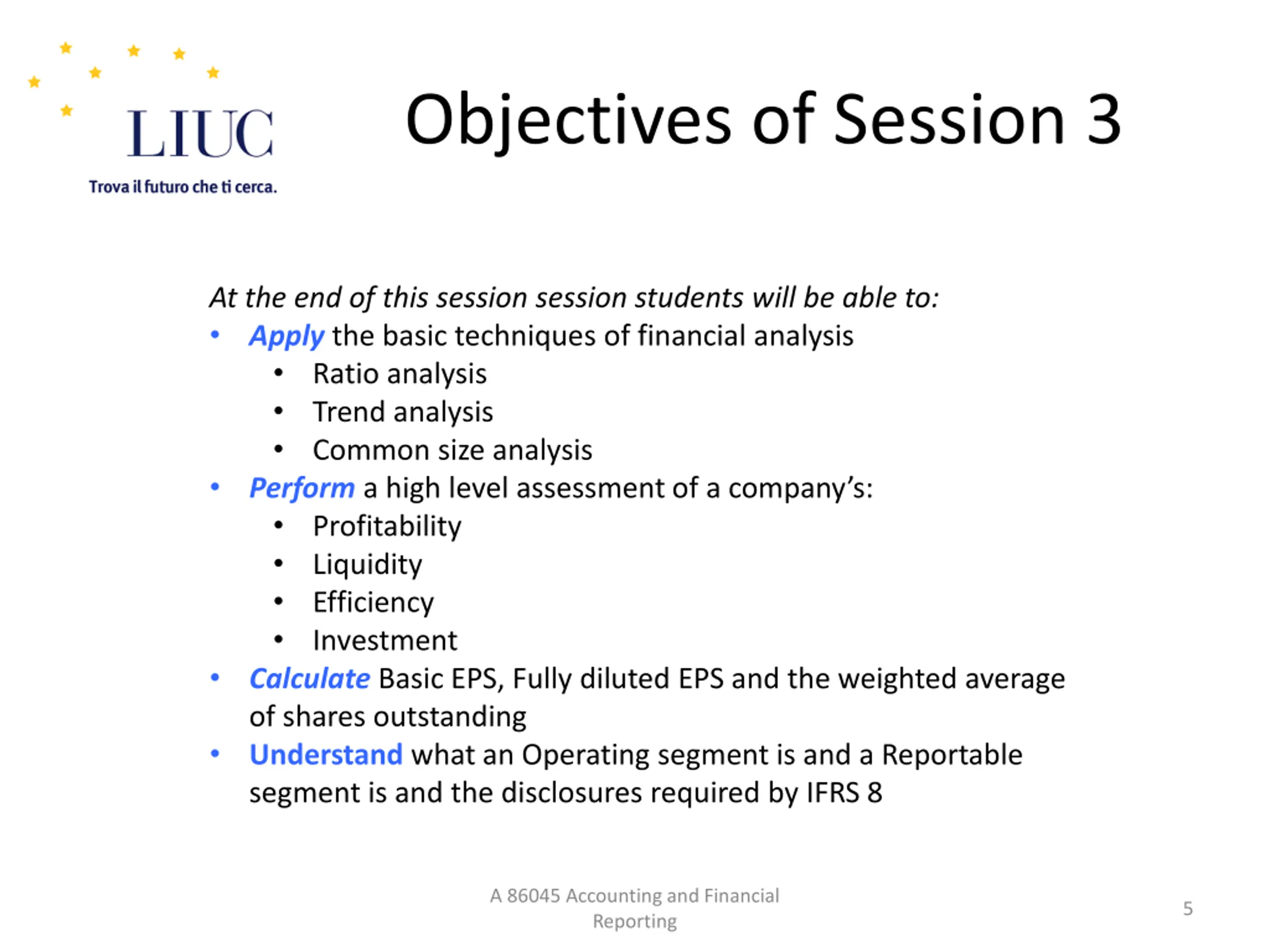 Objectives of Session 3 At the end of this session session students will be able to: Apply the basic techniques of financial analysis Ratio analysis Trend analysis Common size analysis Performa high level assessment of a company s: Profitability Liquidity Efficiency Investment CalculateBasic EPS, Fully diluted EPS and the weighted average of shares outstanding Understand what an Operating segment is and a Reportable segment is and the disclosures required by IFRS 8 A 86045 Accounting and Financial Reporting 5