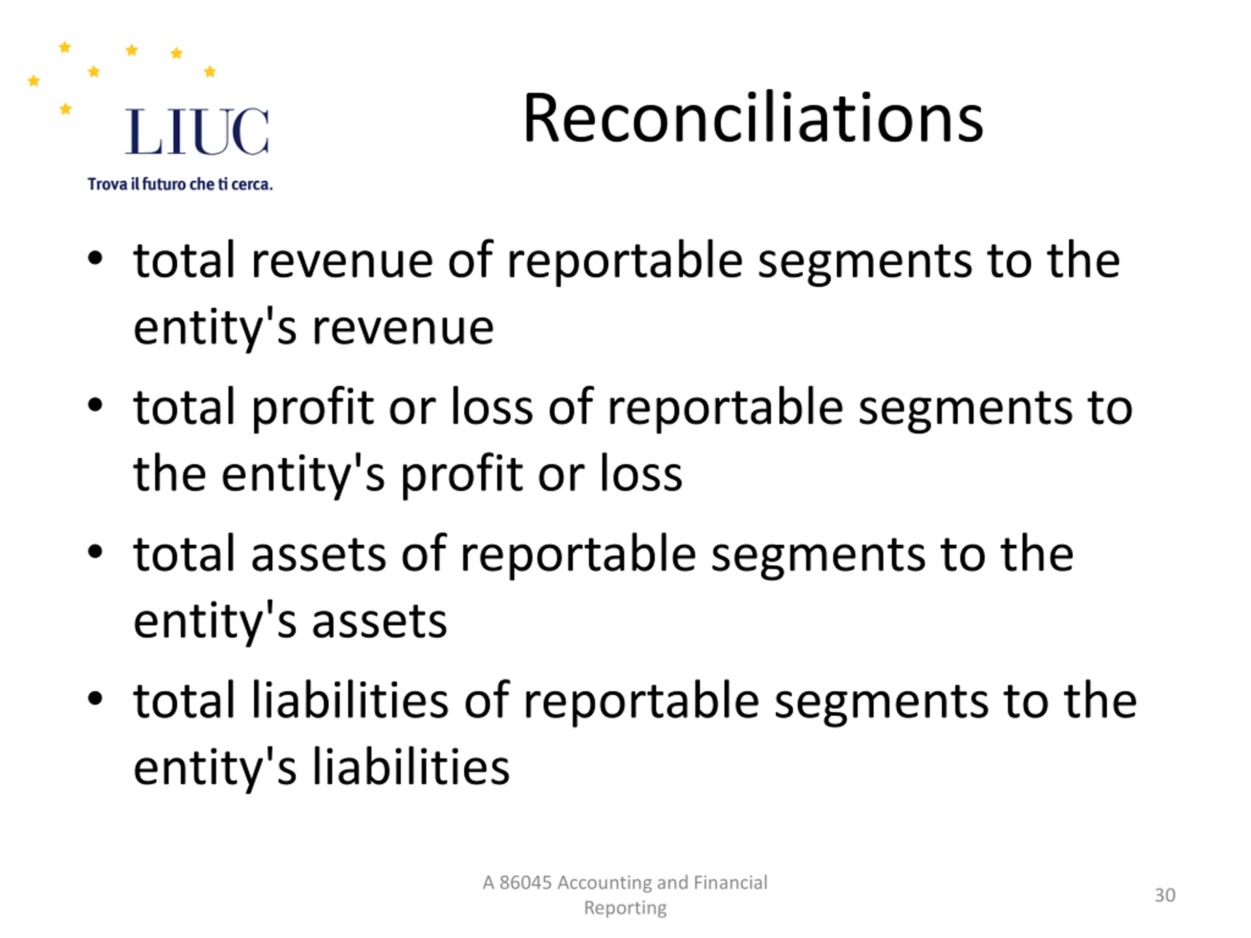 Reconciliations total revenue of reportable segments to the entity's revenue total profit or loss of reportable segments to the entity's profit or loss total assets of reportable segments to the entity's assets total liabilities of reportable segments to the entity's liabilities A 86045 Accounting and Financial Reporting 30