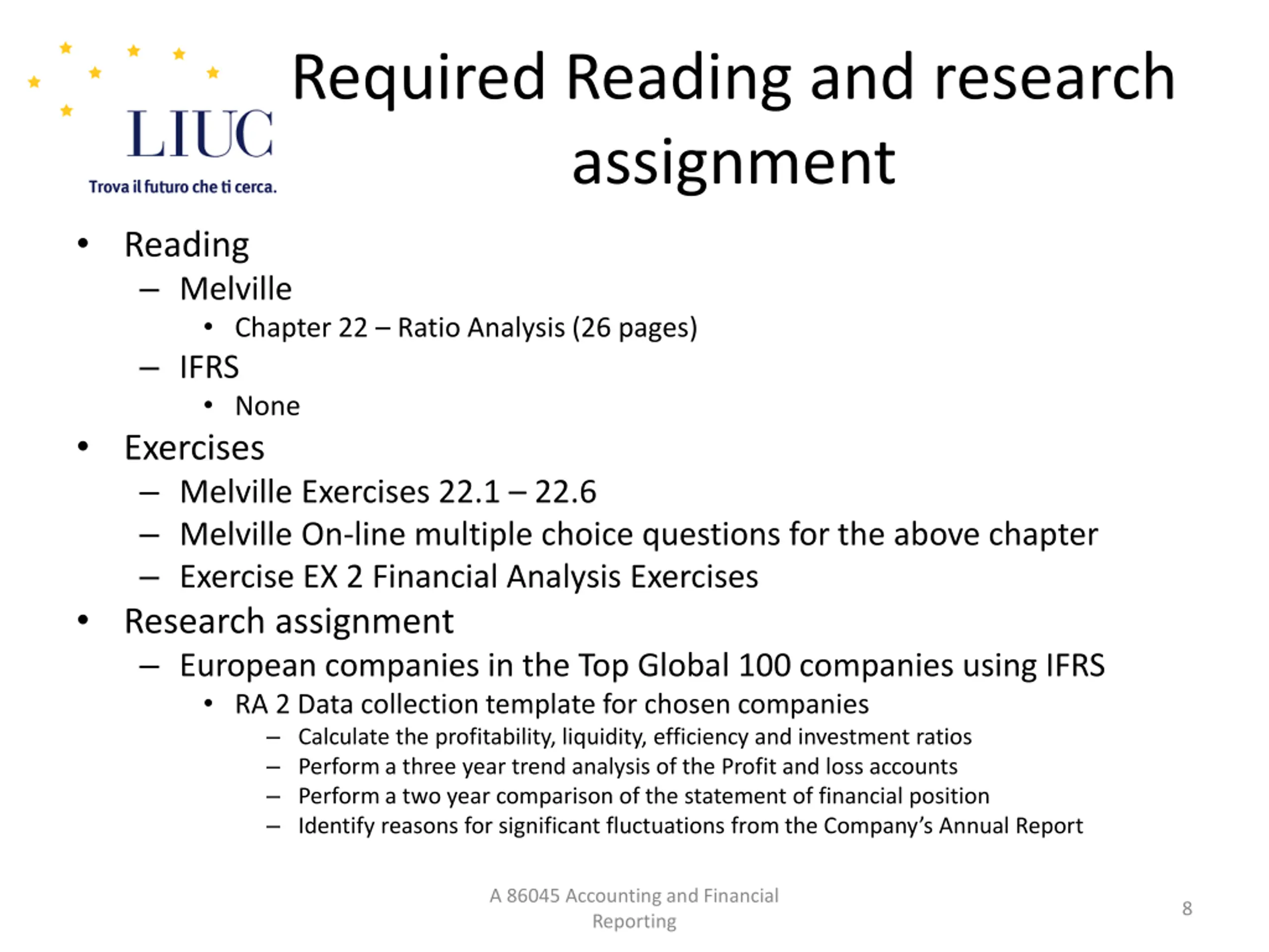 Required Reading and research assignment Reading Melville Chapter 22 Ratio Analysis (26 pages) IFRS None Exercises Melville Exercises 22.1 22.6 Melville On-line multiple choice questions for the above chapter Exercise EX 2 Financial Analysis Exercises Research assignment European companies in the Top Global 100 companies using IFRS RA 2 Data collection template for chosen companies Calculate the profitability, liquidity, efficiency and investment ratios Perform a three year trend analysis of the Profit and loss accounts Perform a two year comparison of the statement of financial position Identify reasons for significant fluctuations from the Company s Annual Report A 86045 Accounting and Financial Reporting 8