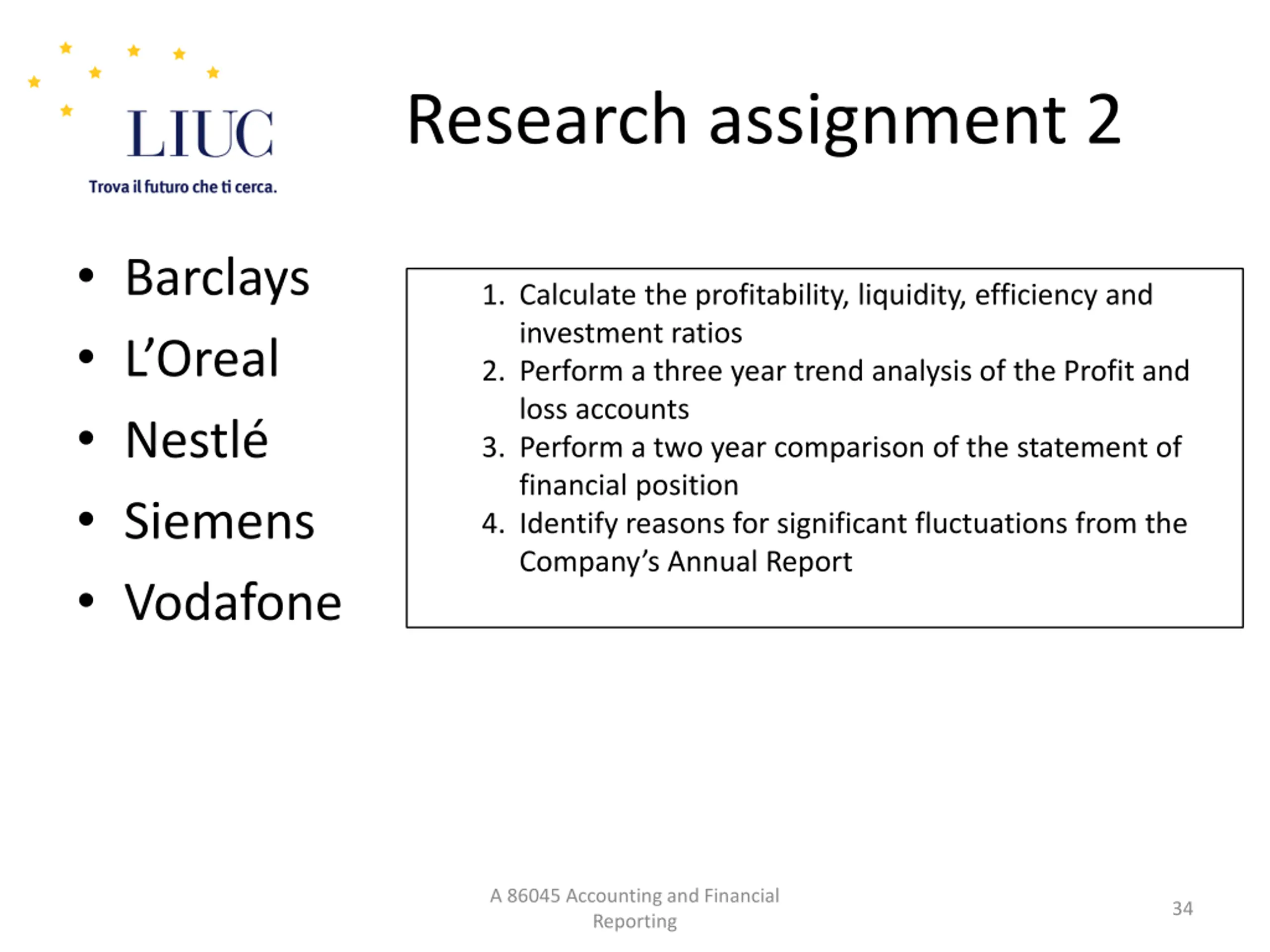 Research assignment 2 Barclays L Oreal Nestl Siemens Vodafone 1. Calculate the profitability, liquidity, efficiency and investment ratios 2. Perform a three year trend analysis of the Profit and loss accounts 3. Perform a two year comparison of the statement of financial position 4. Identify reasons for significant fluctuations from the Company s Annual Report A 86045 Accounting and Financial Reporting 34
