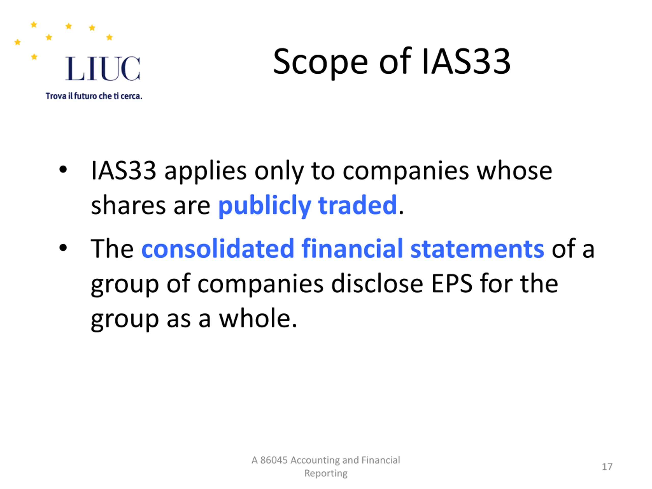 Scope of IAS33 IAS33 applies only to companies whose shares are publicly traded. The consolidated financial statements of a group of companies disclose EPS for the group as a whole. A 86045 Accounting and Financial Reporting 17
