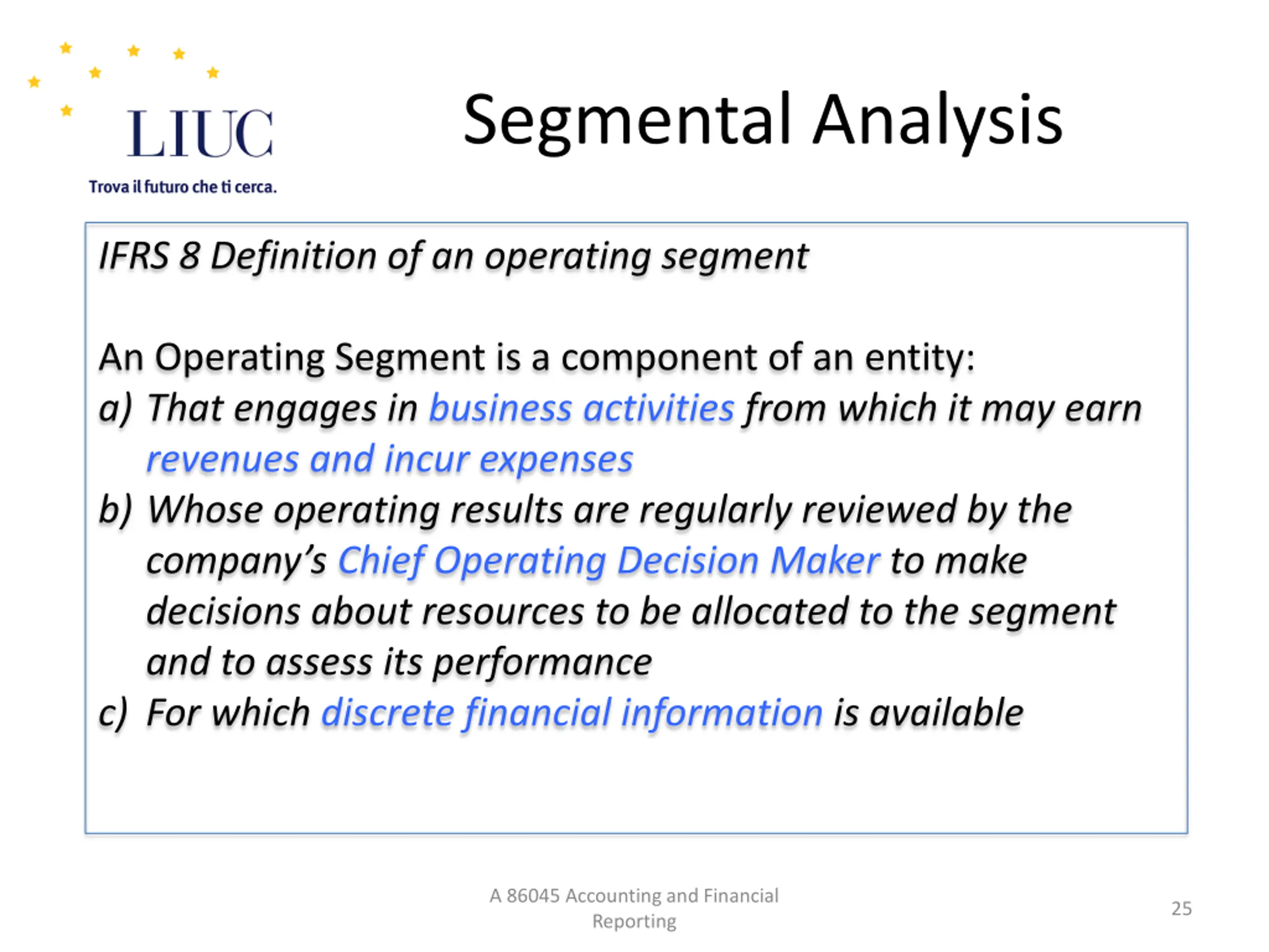 Segmental Analysis IFRS 8 Definition of an operating segment An Operating Segment is a component of an entity: a) That engages in business activities from which it may earn revenues and incur expenses b) Whose operating results are regularly reviewed by the company s Chief Operating Decision Maker to make decisions about resources to be allocated to the segment and to assess its performance c) For which discrete financial information is available A 86045 Accounting and Financial Reporting 25