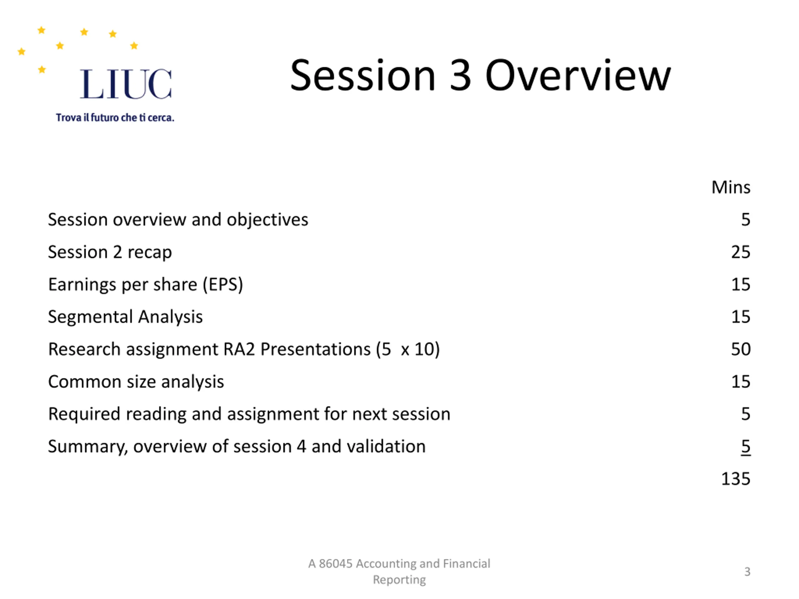 Session 3 Overview Mins Session overview and objectives 5 Session 2 recap 25 Earnings per share (EPS) 15 Segmental Analysis 15 Research assignment RA2 Presentations (5 x 10) 50 Common size analysis 15 Required reading and assignment for next session 5 Summary, overview of session 4 and validation 5 135 A 86045 Accounting and Financial Reporting 3