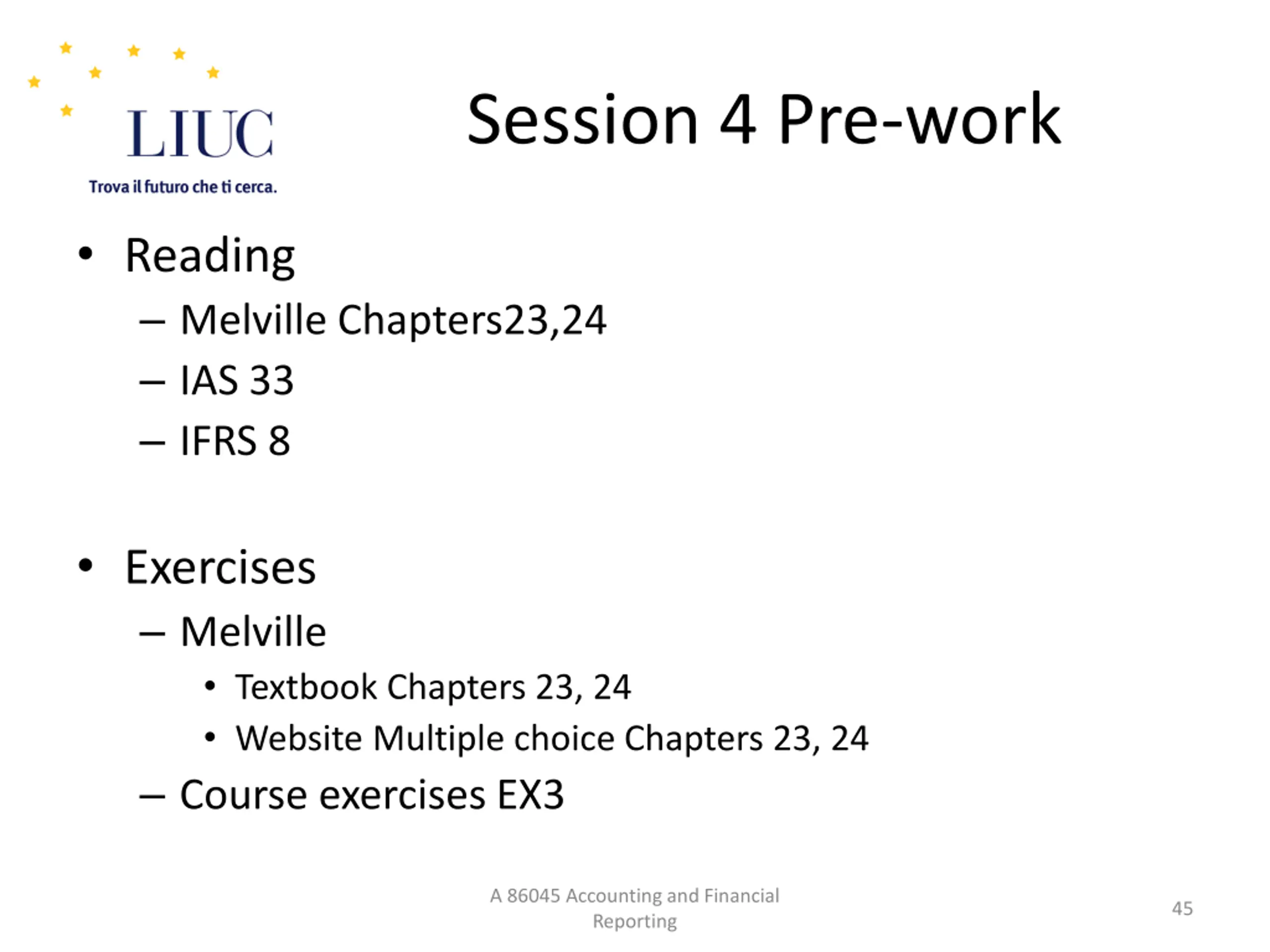 Session 4 Pre-work Reading Melville Chapters23,24 IAS 33 IFRS 8 Exercises Melville Textbook Chapters 23, 24 Website Multiple choice Chapters 23, 24 Course exercises EX3 A 86045 Accounting and Financial Reporting 45