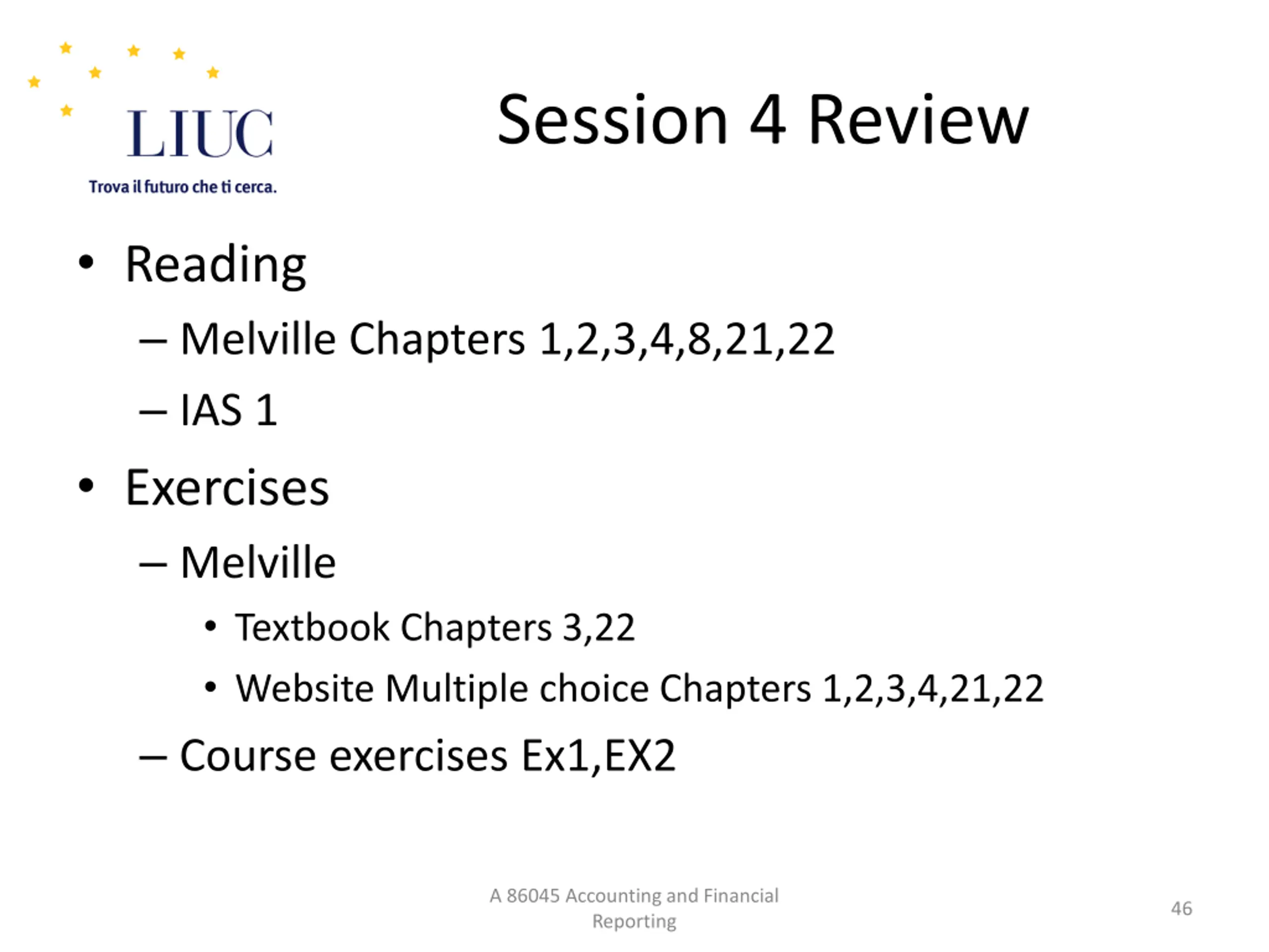 Session 4 Review Reading Melville Chapters 1,2,3,4,8,21,22 IAS 1 Exercises Melville Textbook Chapters 3,22 Website Multiple choice Chapters 1,2,3,4,21,22 Course exercises Ex1,EX2 A 86045 Accounting and Financial Reporting 46