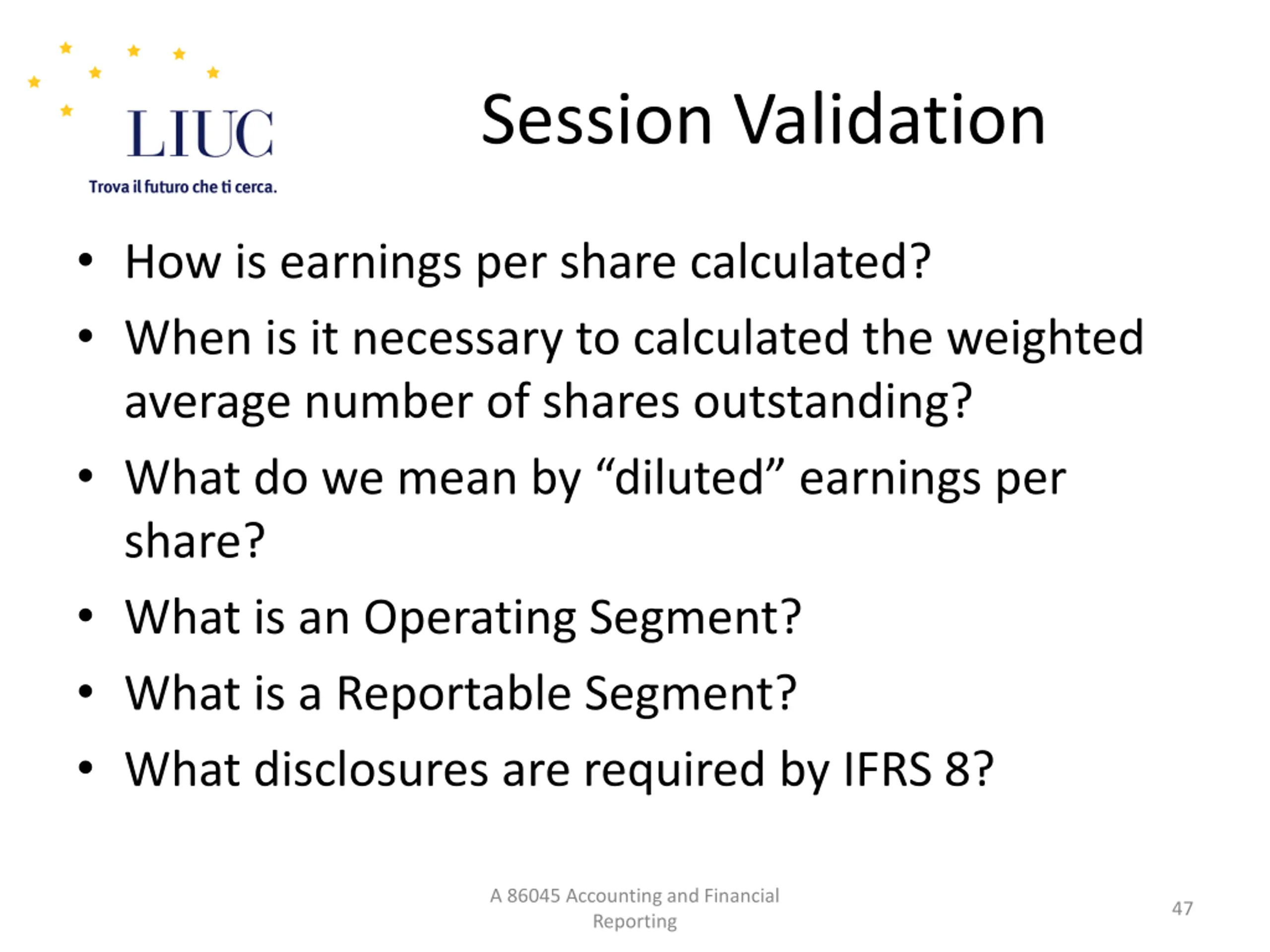 Session Validation How is earnings per share calculated? When is it necessary to calculated the weighted average number of shares outstanding? What do we mean by diluted earnings per share? What is an Operating Segment? What is a Reportable Segment? What disclosures are required by IFRS 8? A 86045 Accounting and Financial Reporting 47