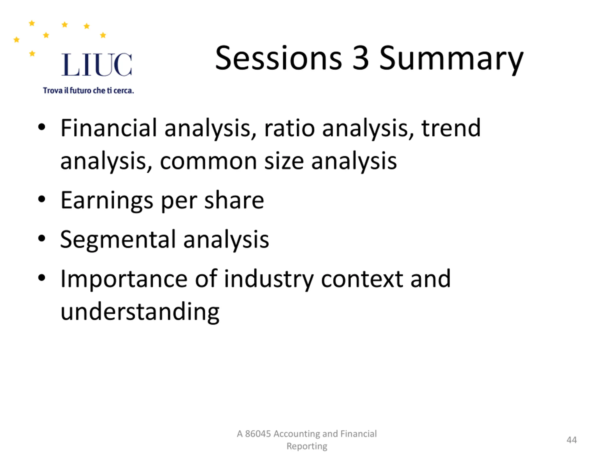 Sessions 3 Summary Financial analysis, ratio analysis, trend analysis, common size analysis Earnings per share Segmental analysis Importance of industry context and understanding A 86045 Accounting and Financial Reporting 44