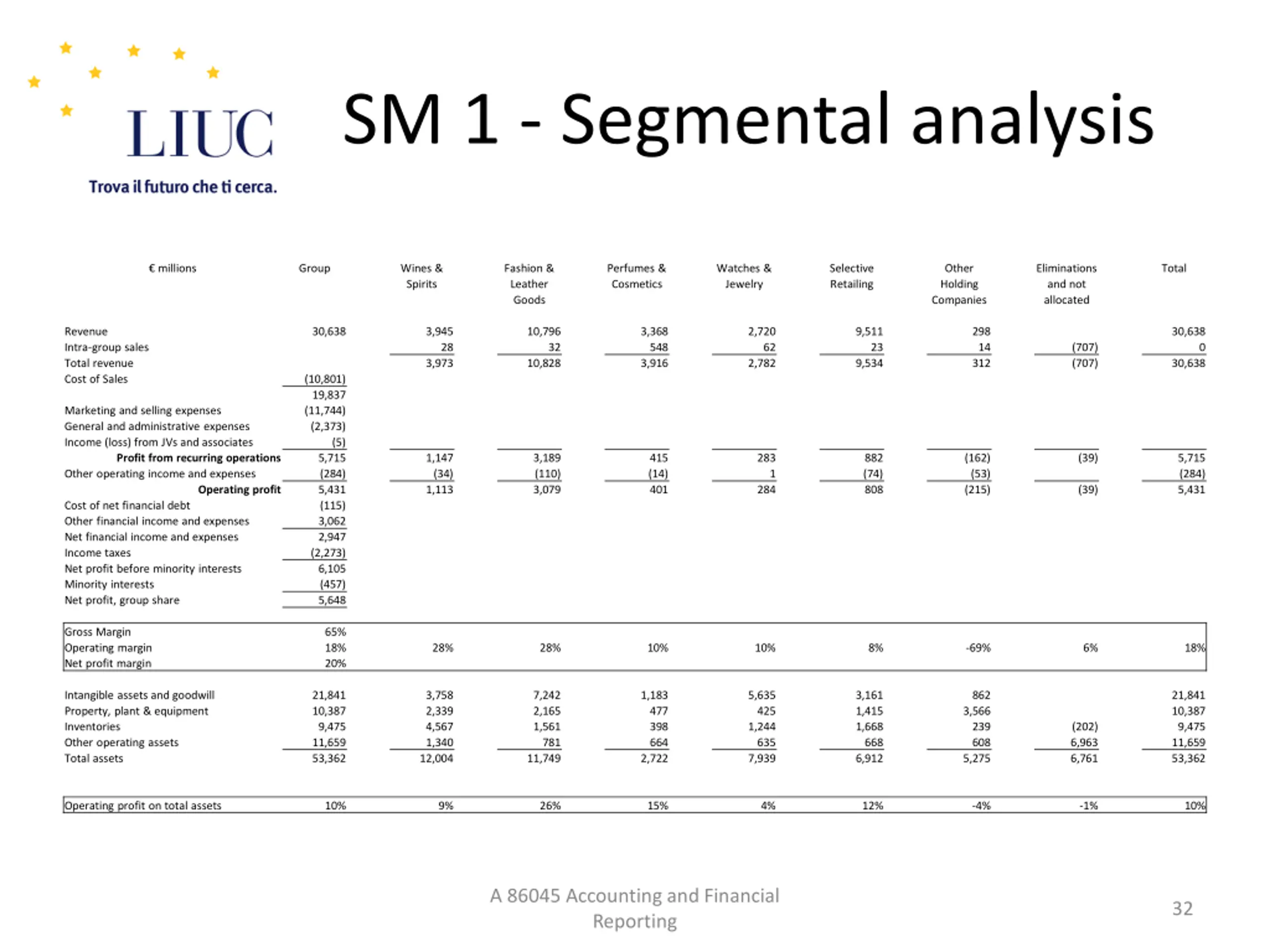 SM 1 - Segmental analysis millions Group Wines & Spirits Fashion & Leather Goods Perfumes & Cosmetics Watches & Jewelry Selective Retailing Other Holding Companies Eliminations and not allocated Total Revenue Intra-group sales Total revenue Cost of Sales 30,638 3,945 10,796 3,368 548 3,916 2,720 9,511 298 14 312 30,638 28 32 62 23 (707) (707) 0 3,973 10,828 2,782 9,534 30,638 (10,801) 19,837 (11,744) (2,373) Marketing and selling expenses General and administrative expenses Income (loss) from JVs and associates Profit from recurring operations Other operating income and expenses (5) 5,715 (284) 5,431 (115) 3,062 2,947 (2,273) 6,105 (457) 5,648 1,147 (34) 1,113 3,189 (110) 3,079 415 (14) 401 283 882 (74) 808 (162) (53) (215) (39) 5,715 (284) 5,431 1 Operating profit 284 (39) Cost of net financial debt Other financial income and expenses Net financial income and expenses Income taxes Net profit before minority interests Minority interests Net profit, group share Gross Margin Operating margin Net profit margin 65% 18% 20% 28% 28% 10% 10% 8% -69% 6% 18% Intangible assets and goodwill Property, plant & equipment Inventories Other operating assets Total assets 21,841 10,387 9,475 11,659 53,362 3,758 2,339 4,567 1,340 12,004 7,242 2,165 1,561 781 11,749 1,183 477 398 664 2,722 5,635 425 1,244 635 7,939 3,161 1,415 1,668 668 6,912 862 3,566 239 608 5,275 21,841 10,387 9,475 11,659 53,362 (202) 6,963 6,761 Operating profit on total assets 10% 9% 26% 15% 4% 12% -4% -1% 10% A 86045 Accounting and Financial Reporting 32