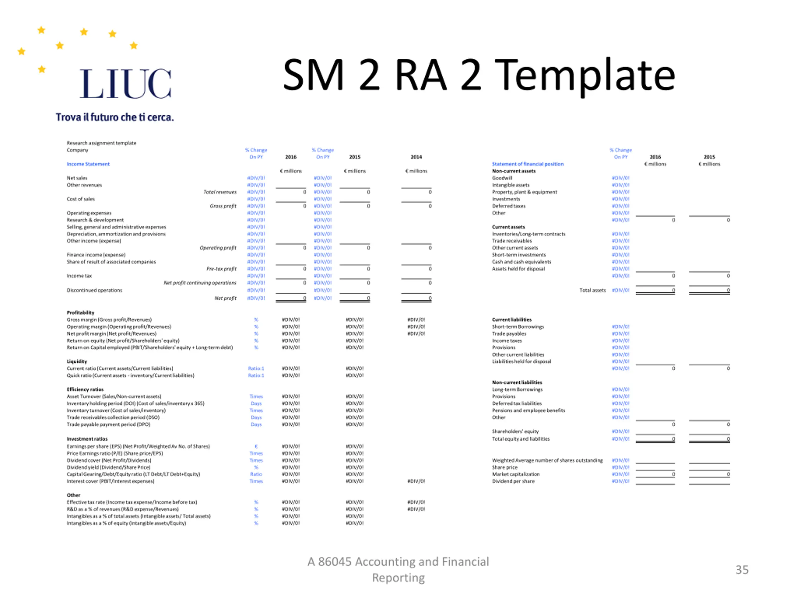 SM 2 RA 2 Template Research assignment template Company % Change On PY % Change On PY % Change On PY 2016 2015 2014 2016 millions 2015 millions Income Statement Statement of financial position Non-current assets Goodwill Intangible assets Property, plant & equipment Investments Deferred taxes Other millions millions millions Net sales Other revenues #DIV/0! #DIV/0! #DIV/0! #DIV/0! #DIV/0! #DIV/0! #DIV/0! #DIV/0! #DIV/0! #DIV/0! #DIV/0! #DIV/0! #DIV/0! #DIV/0! #DIV/0! #DIV/0! #DIV/0! #DIV/0! #DIV/0! #DIV/0! #DIV/0! #DIV/0! #DIV/0! #DIV/0! #DIV/0! #DIV/0! #DIV/0! #DIV/0! #DIV/0! #DIV/0! #DIV/0! #DIV/0! #DIV/0! #DIV/0! #DIV/0! #DIV/0! #DIV/0! #DIV/0! #DIV/0! #DIV/0! #DIV/0! #DIV/0! #DIV/0! Total revenues 0 0 0 Cost of sales Gross profit 0 0 0 Operating expenses Research & development Selling, general and administrative expenses Depreciation, ammortization and provisions Other income (expense) 0 0 Current assets Inventories/Long-term contracts Trade receivables Other current assets Short-term investments Cash and cash equivalents Assets held for disposal #DIV/0! #DIV/0! #DIV/0! #DIV/0! #DIV/0! #DIV/0! #DIV/0! Operating profit 0 0 0 Finance income (expense) Share of result of associated companies Pre-tax profit 0 0 0 Income tax 0 0 Net profit continuing operations 0 0 0 Discontinued operations Total assets #DIV/0! 0 0 Net profit 0 0 0 Profitability Gross margin (Gross profit/Revenues) Operating margin (Operating profit/Revenues) Net profit margin (Net profit/Revenues) Return on equity (Net profit/Shareholders' equity) Return on Capital employed (PBIT/Shareholders' equity + Long-term debt) % % % % % #DIV/0! #DIV/0! #DIV/0! #DIV/0! #DIV/0! #DIV/0! #DIV/0! #DIV/0! #DIV/0! #DIV/0! #DIV/0! #DIV/0! #DIV/0! Current liabilities Short-term Borrowings Trade payables Income taxes Provisions Other current liabilities Liabilities held for disposal #DIV/0! #DIV/0! #DIV/0! #DIV/0! #DIV/0! #DIV/0! #DIV/0! Liquidity Current ratio (Current assets/Current liabilities) Quick ratio (Current assets - inventory/Current liabilities) Ratio:1 Ratio:1 #DIV/0! #DIV/0! #DIV/0! #DIV/0! 0 0 Non-current liabilities Long-term Borrowings Provisions Deferred tax liabilities Pensions and employee benefits Other Efficiency ratios Asset Turnover (Sales/Non-current assets) Inventory holding period (DOI) (Cost of sales/inventory x 365) Inventory turnover (Cost of sales/inventory) Trade receivables collection period (DSO) Trade payable payment period (DPO) #DIV/0! #DIV/0! #DIV/0! #DIV/0! #DIV/0! Times Days Times Days Days #DIV/0! #DIV/0! #DIV/0! #DIV/0! #DIV/0! #DIV/0! #DIV/0! #DIV/0! #DIV/0! #DIV/0! 0 0 Shareholders' equity Total equity and liabilities #DIV/0! #DIV/0! Investment ratios Earnings per share (EPS) (Net Profit/Weighted Av No. of Shares) Price Earnings ratio (P/E) (Share price/EPS) Dividend cover (Net Profit/Dividends) Dividend yield (Dividend/Share Price) Capital Gearing/Debt/Equity ratio (LT Debt/LT Debt+Equity) Interest cover (PBIT/Interest expenses) 0 0 #DIV/0! #DIV/0! #DIV/0! #DIV/0! #DIV/0! #DIV/0! #DIV/0! #DIV/0! #DIV/0! #DIV/0! #DIV/0! #DIV/0! Times Times % Ratio Times Weighted Average number of shares outstanding Share price Market capitalization Dividend per share #DIV/0! #DIV/0! #DIV/0! #DIV/0! 0 0 #DIV/0! Other Effective tax rate (Income tax expense/Income before tax) R&D as a % of revenues (R&D expense/Revenues) Intangibles as a % of total assets (Intangible assets/ Total assets) Intangibles as a % of equity (Intangible assets/Equity) % % % % #DIV/0! #DIV/0! #DIV/0! #DIV/0! #DIV/0! #DIV/0! #DIV/0! #DIV/0! #DIV/0! #DIV/0! A 86045 Accounting and Financial Reporting 35