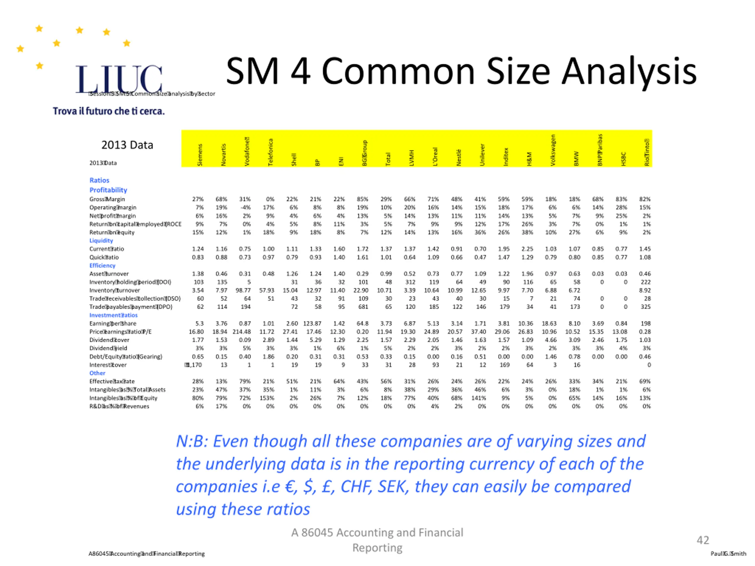 SM 4 Common Size Analysis ? Session? 3? SM? 5? Common? size? analysis? by? sector BNP? Paribas Volkswagen Vodafone? Telefonica Rio? Tinto? 2013 Data BG? Group Unilever Novartis Siemens L'Oreal Inditex Nestl LVMH BMW H&M HSBC Total Shell ENI BP 2013? Data Ratios Profitability Gross? Margin Operating? margin Net? profit? margin Return? on? capital? employed? (ROCE) Return? on? equity Liquidity Current? ratio Quick? ratio Efficiency Asset? turnover Inventory? holding? period? (DOI) Inventory? turnover Trade? receivables? collection? (DSO) Trade? payables? payment? (DPO) Investment? ratios Earning? per? share Price? earnings? ratio? P/E Dividend? cover Dividend? yield Debt/Equity? ratio? (Gearing) Interest? cover Other Effective? tax? rate Intangibles? as? %? Total? Assets Intangibles? as? %? of? Equity R&D? as? %? of? Revenues 27% 7% 6% 9% 15% 68% 19% 16% 7% 12% 31% -4% 2% 0% 1% 0% 17% 9% 4% 18% 22% 6% 4% 5% 9% 21% 8% 6% 8% 18% 22% 8% 4% 11% 8% 85% 19% 13% 3% 7% 29% 10% 5% 5% 12% 66% 20% 14% 7% 14% 71% 16% 13% 9% 13% 48% 14% 11% 9% 16% 41% 15% 11% 12% 36% 59% 18% 14% 17% 26% 59% 17% 13% 26% 38% 18% 6% 5% 3% 10% 18% 6% 7% 7% 27% 68% 14% 9% 0% 6% 83% 28% 25% 1% 9% 82% 15% 2% 1% 2% 1.24 0.83 1.16 0.88 0.75 0.73 1.00 0.97 1.11 0.79 1.33 0.93 1.60 1.40 1.72 1.61 1.37 1.01 1.37 0.64 1.42 1.09 0.91 0.66 0.70 0.47 1.95 1.47 2.25 1.29 1.03 0.79 1.07 0.80 0.85 0.85 0.77 0.77 1.45 1.08 1.38 103 3.54 60 62 0.46 135 7.97 52 114 0.31 0.48 1.26 31 15.04 1.24 36 12.97 1.40 32 11.40 0.29 101 22.90 109 681 0.99 48 10.71 0.52 312 3.39 23 120 0.73 119 10.64 0.77 64 10.99 1.09 49 12.65 1.22 90 9.97 15 179 1.96 116 7.70 0.97 65 6.88 21 41 0.63 58 6.72 74 173 0.03 0.03 0.46 222 8.92 28 325 5 0 0 98.77 57.93 64 51 43 72 32 58 91 95 30 65 43 40 30 7 0 0 0 0 194 185 122 146 34 5.3 3.76 18.94 214.48 1.53 3% 0.15 13 0.87 1.01 11.72 2.89 3% 1.86 2.60 123.87 27.41 1.44 3% 0.20 19 1.42 12.30 1.29 6% 0.31 64.8 0.20 2.25 1% 0.53 33 3.73 11.94 1.57 5% 0.33 6.87 19.30 2.29 2% 0.15 5.13 24.89 2.05 2% 0.00 3.14 20.57 1.46 3% 0.16 1.71 37.40 1.63 2% 0.51 3.81 29.06 1.57 2% 0.00 169 10.36 26.83 1.09 3% 0.00 18.63 10.96 4.66 2% 1.46 8.10 10.52 3.09 3% 0.78 3.69 15.35 2.46 3% 0.00 0.84 13.08 1.75 4% 0.00 198 0.28 1.03 3% 0.46 16.80 1.77 3% 0.65 1,170 ? ? 17.46 5.29 1% 0.31 0.09 5% 0.40 1 1 19 9 31 28 93 21 12 64 3 16 0 28% 23% 80% 6% 13% 47% 79% 17% 79% 37% 72% 0% 21% 35% 153% 0% 51% 1% 2% 0% 21% 11% 26% 0% 64% 3% 7% 0% 43% 6% 12% 0% 56% 8% 18% 0% 31% 38% 77% 0% 26% 29% 40% 4% 24% 36% 68% 2% 26% 46% 141% 0% 22% 6% 9% 0% 24% 3% 5% 0% 26% 0% 0% 0% 33% 18% 65% 0% 34% 1% 14% 0% 21% 1% 16% 0% 69% 6% 13% 0% N:B: Even though all these companies are of varying sizes and the underlying data is in the reporting currency of each of the companies i.e , $, , CHF, SEK, they can easily be compared using these ratios A 86045 Accounting and Financial Reporting 42 A86045? Accounting? and? Financial? Reporting Paul? G.? Smith
