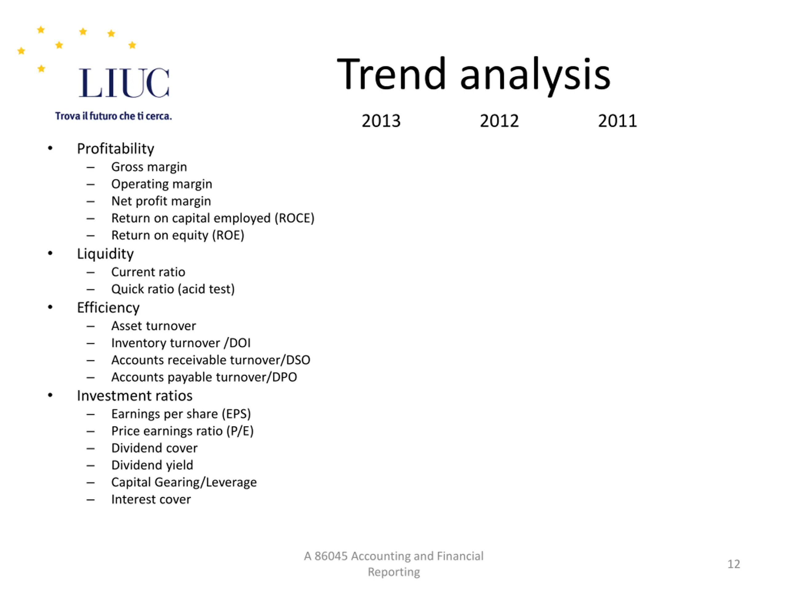 Trend analysis 2013 2012 2011 Profitability Gross margin Operating margin Net profit margin Return on capital employed (ROCE) Return on equity (ROE) Liquidity Current ratio Quick ratio (acid test) Efficiency Asset turnover Inventory turnover /DOI Accounts receivable turnover/DSO Accounts payable turnover/DPO Investment ratios Earnings per share (EPS) Price earnings ratio (P/E) Dividend cover Dividend yield Capital Gearing/Leverage Interest cover A 86045 Accounting and Financial Reporting 12