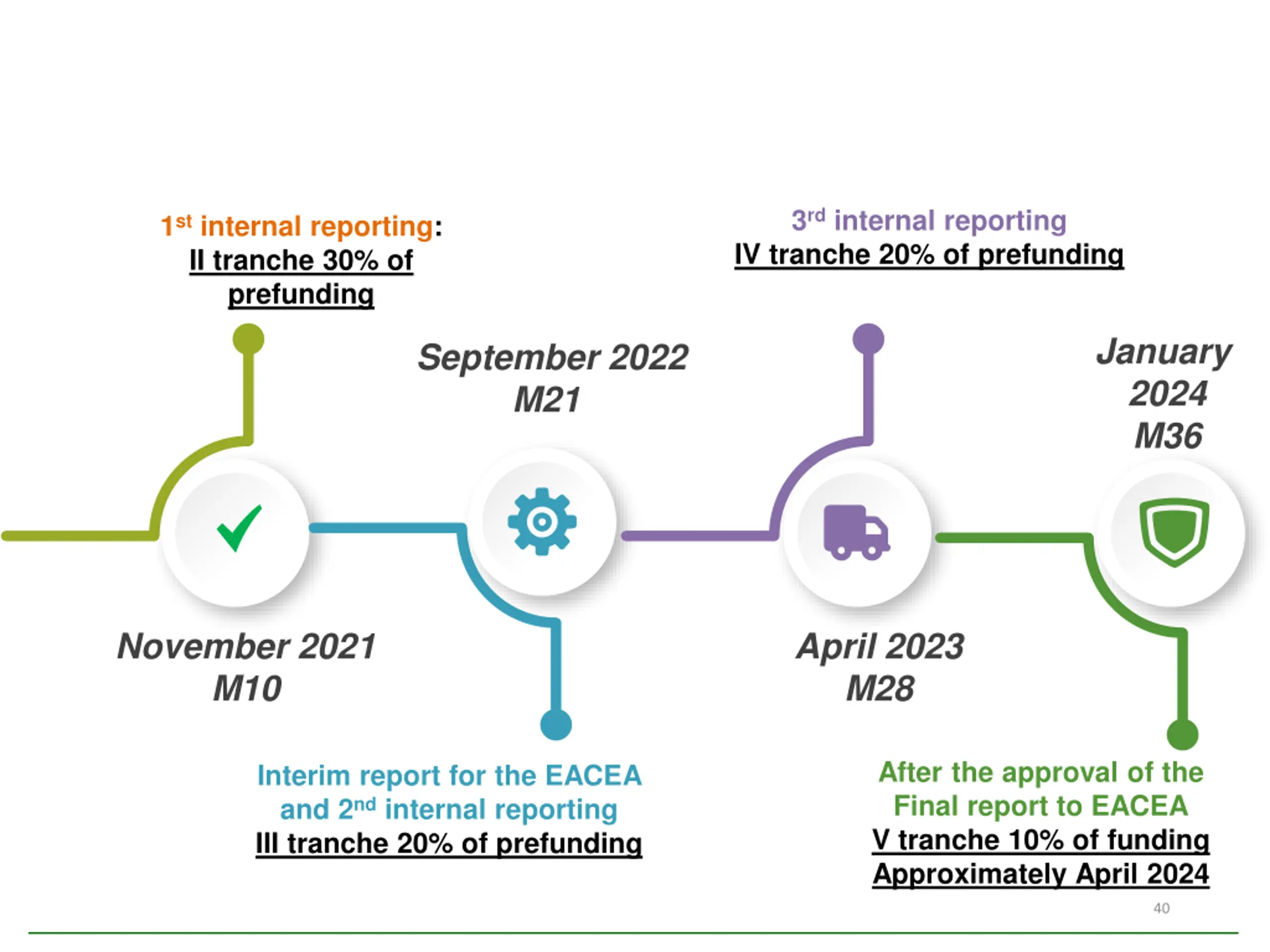 3rdinternal reporting IV tranche 20% of prefunding 1stinternal reporting: II tranche 30% of prefunding January 2024 M36 September 2022 M21 November 2021 M10 April 2023 M28 After the approval of the Final report to EACEA V tranche 10% of funding Approximately April 2024 Interim report for the EACEA and 2ndinternal reporting III tranche 20% of prefunding 40