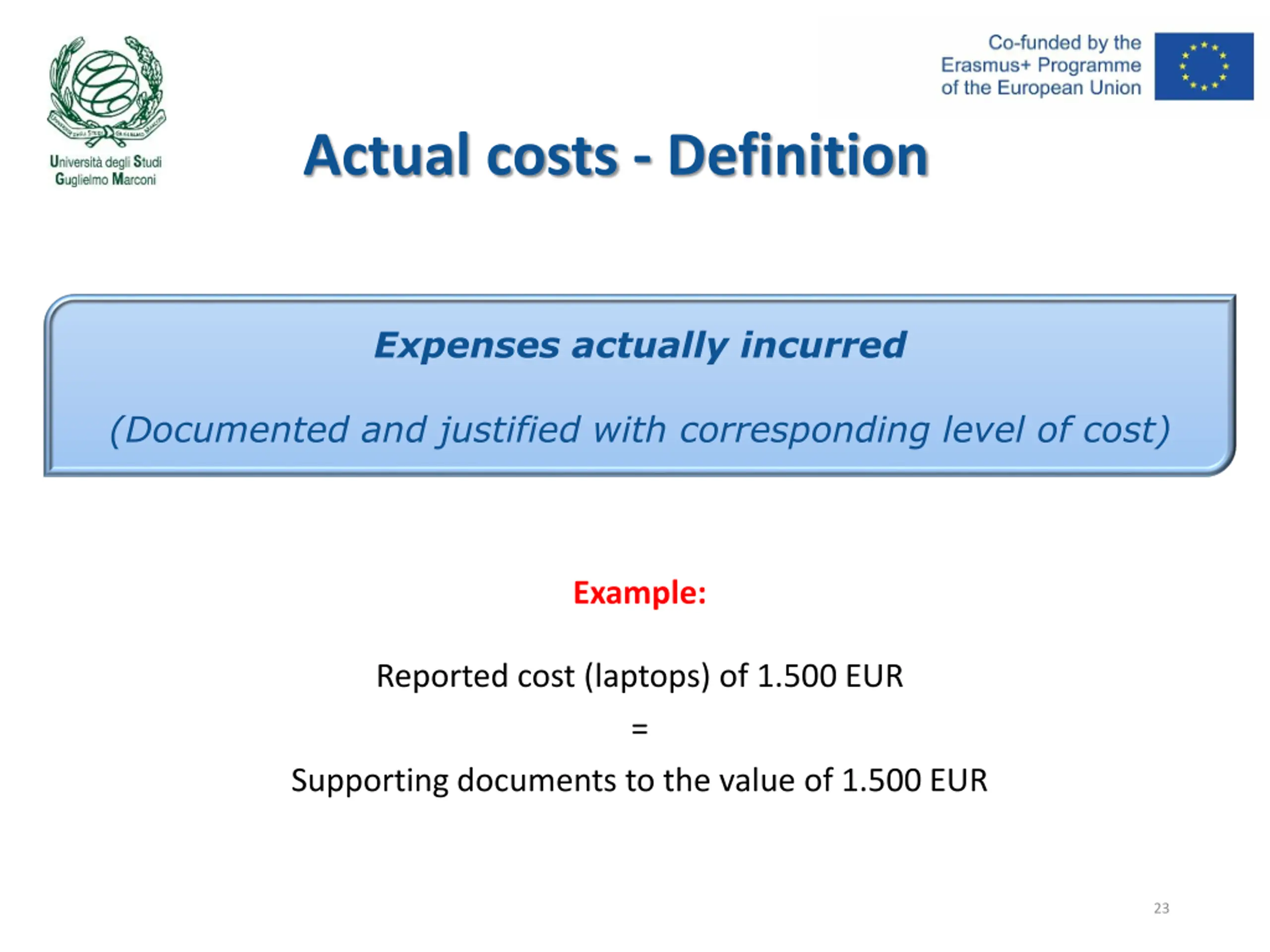 Actual costs - Definition Expenses actually incurred (Documented and justified with corresponding level of cost) Example: Reported cost (laptops) of 1.500 EUR = Supporting documents to the value of 1.500 EUR 23