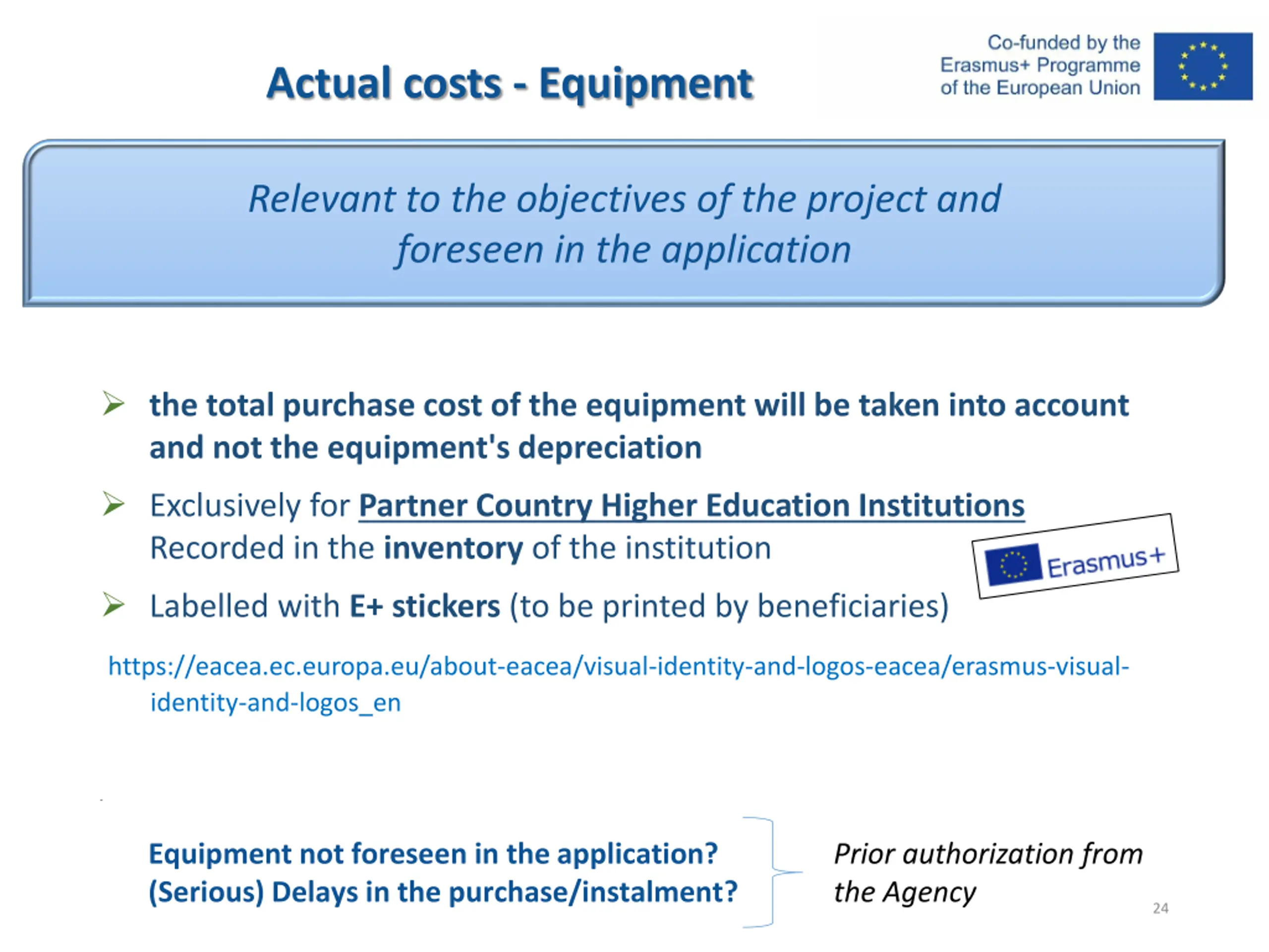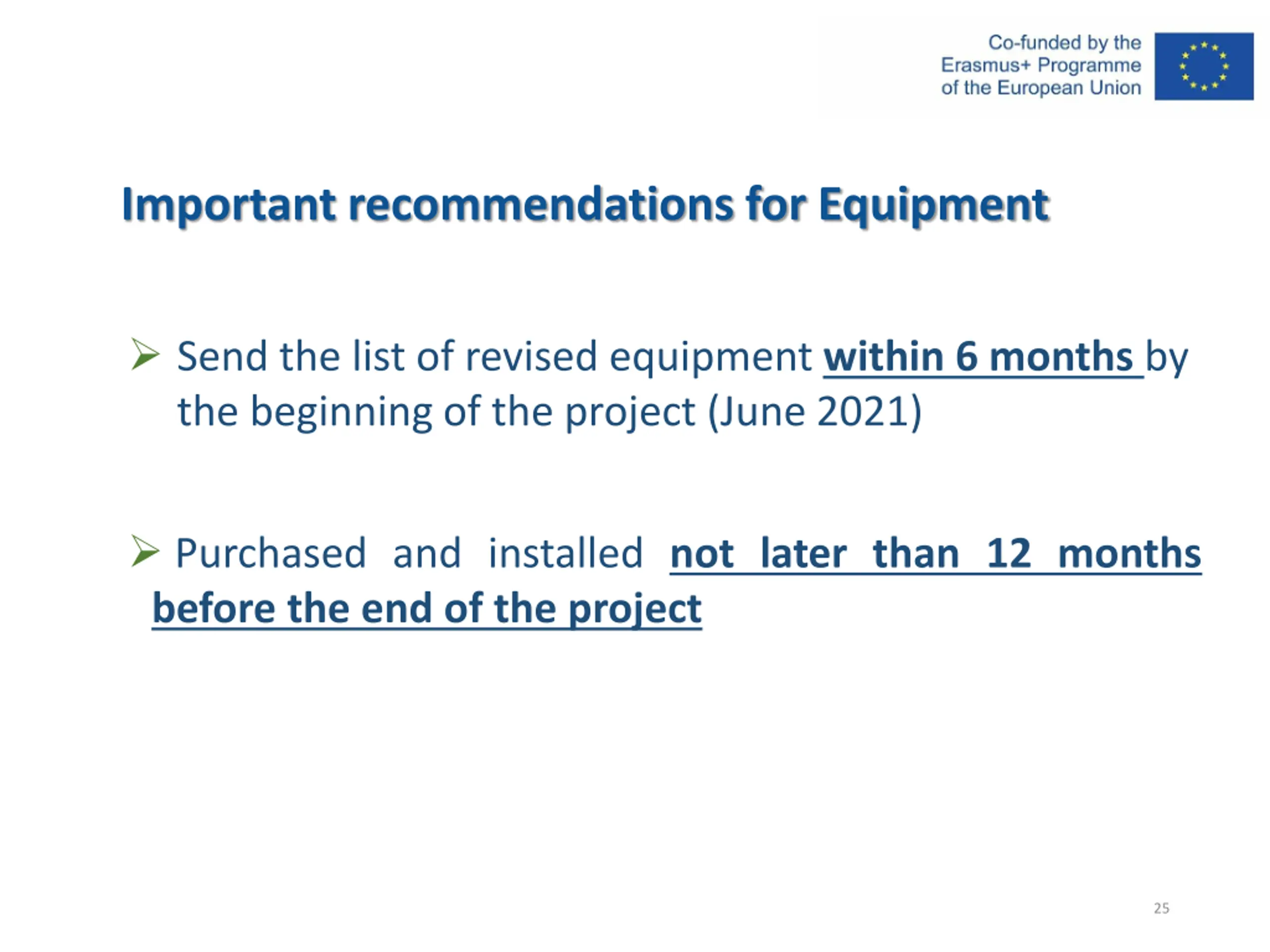 Actual costs - Equipment Relevant to the objectives of the project and foreseen in the application the total purchase cost of the equipment will be taken into account and not the equipment's depreciation Exclusively for Partner Country Higher Education Institutions Recorded in the inventory of the institution Labelled with E+ stickers (to be printed by beneficiaries) https://eacea.ec.europa.eu/about-eacea/visual-identity-and-logos-eacea/erasmus-visual- identity-and-logos_en - Equipment not foreseen in the application? (Serious) Delays in the purchase/instalment? Prior authorization from the Agency 24