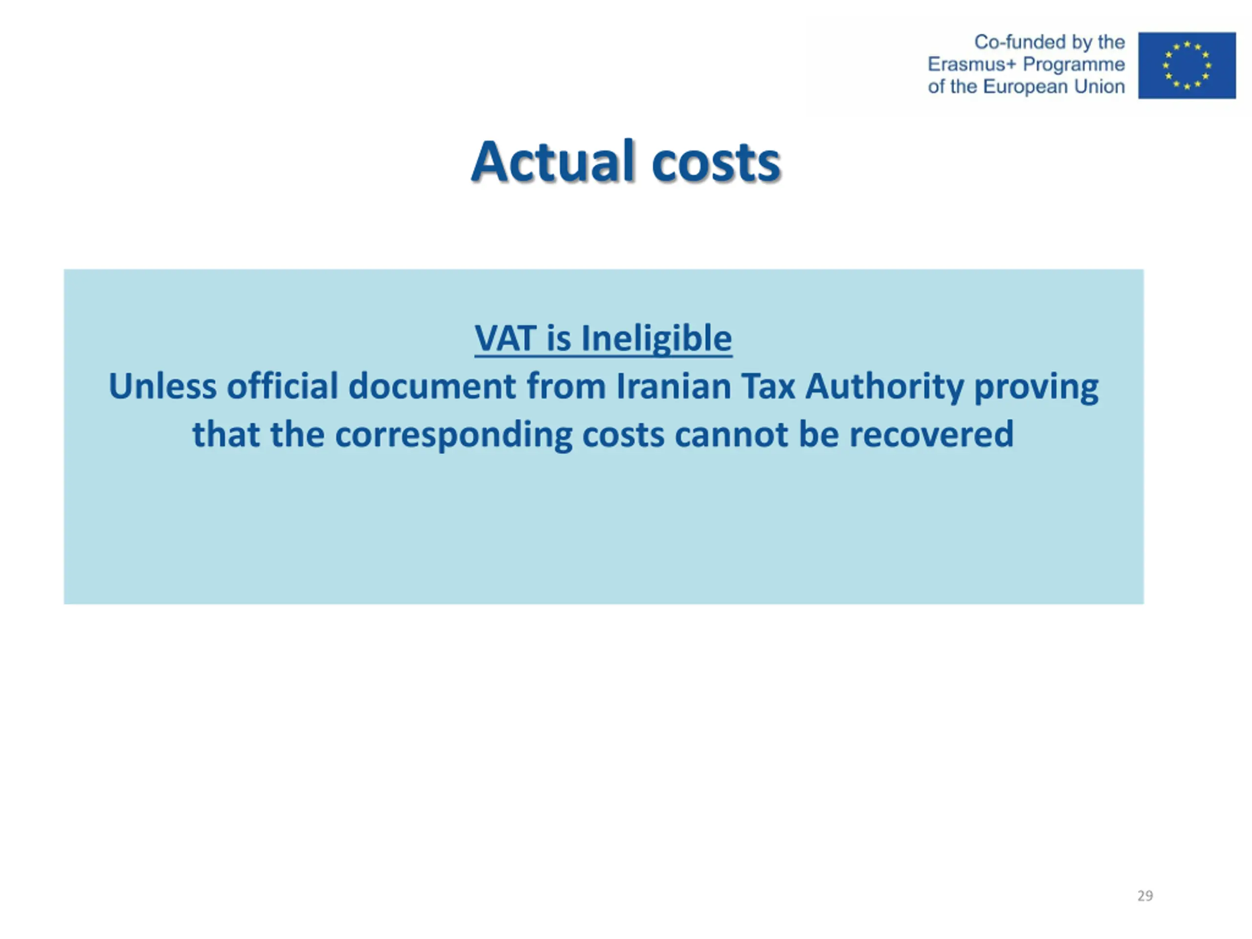 Actual costs VAT is Ineligible Unless official document from Iranian Tax Authority proving that the corresponding costs cannot be recovered 29