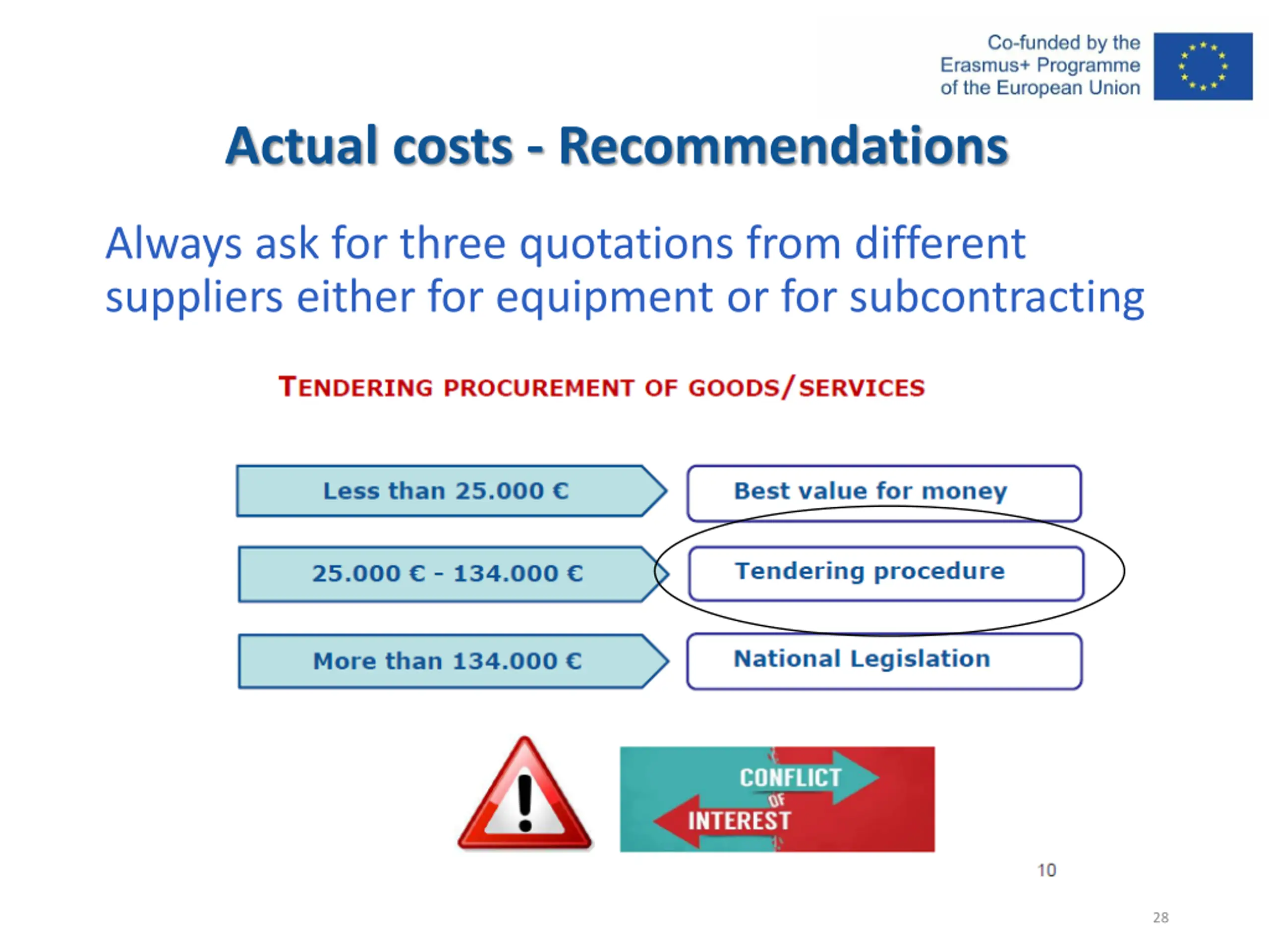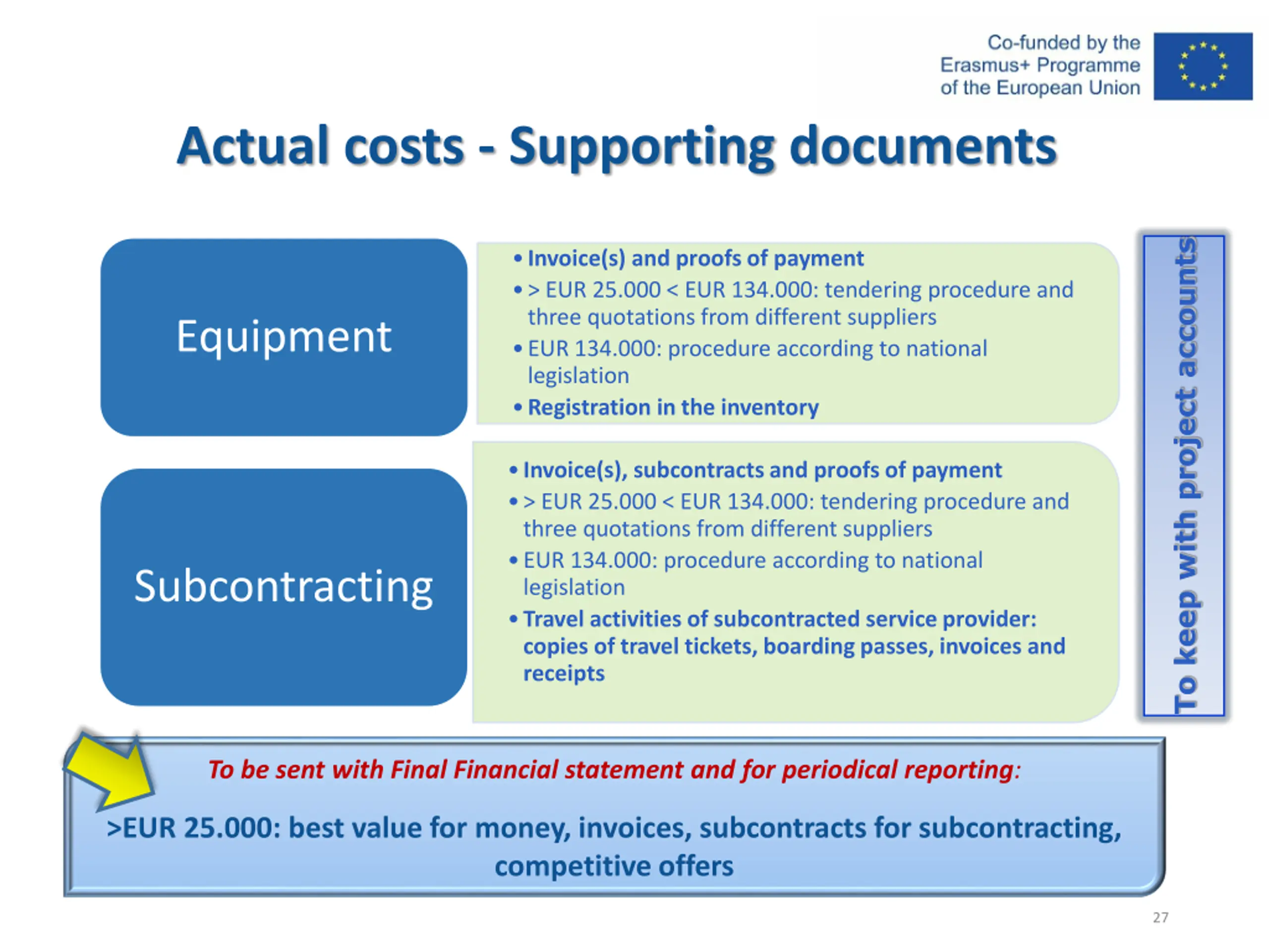 Actual costs - Supporting documents To keep with project accounts Invoice(s) and proofs of payment > EUR 25.000 < EUR 134.000: tendering procedure and three quotations from different suppliers EUR 134.000: procedure according to national legislation Registration in the inventory Equipment Invoice(s), subcontracts and proofs of payment > EUR 25.000 < EUR 134.000: tendering procedure and three quotations from different suppliers EUR 134.000: procedure according to national legislation Travel activities of subcontracted service provider: copies of travel tickets, boarding passes, invoices and receipts Subcontracting To be sent with Final Financial statement and for periodical reporting: >EUR 25.000: best value for money, invoices, subcontracts for subcontracting, competitive offers 27