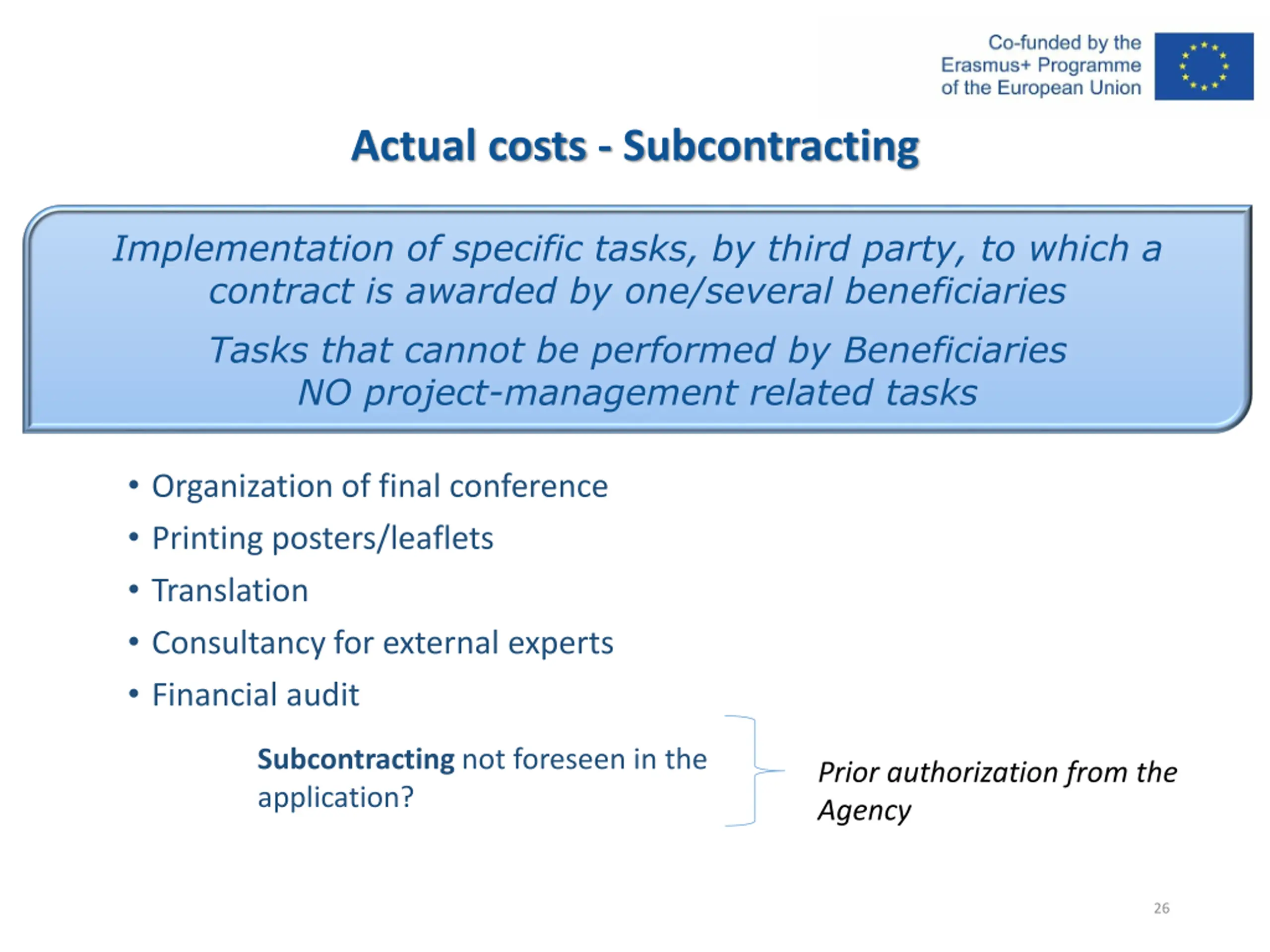 Actual costs - Subcontracting Implementation of specific tasks, by third party, to which a contract is awarded by one/several beneficiaries Tasks that cannot be performed by Beneficiaries NO project-management related tasks Organization of final conference Printing posters/leaflets Translation Consultancy for external experts Financial audit Subcontracting not foreseen in the application? Prior authorization from the Agency 26