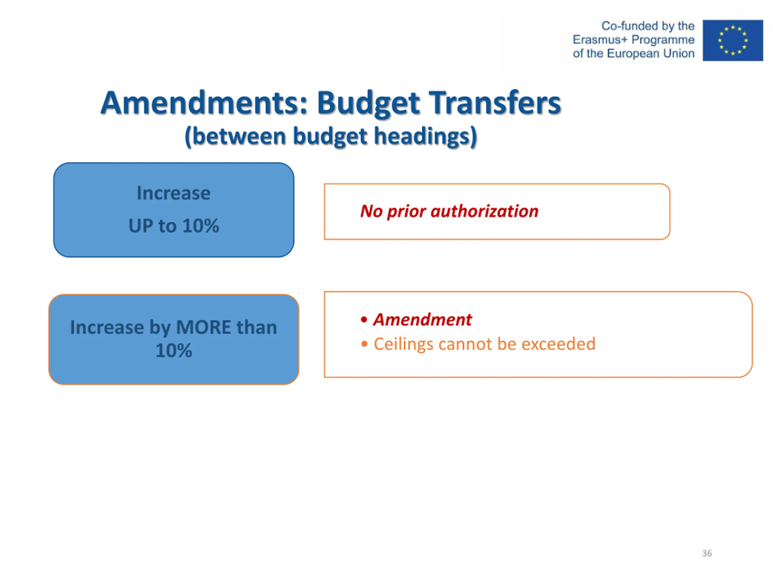 Amendments: Budget Transfers (between budget headings) Increase No prior authorization UP to 10% Amendment Ceilings cannot be exceeded Increase by MORE than 10% 36