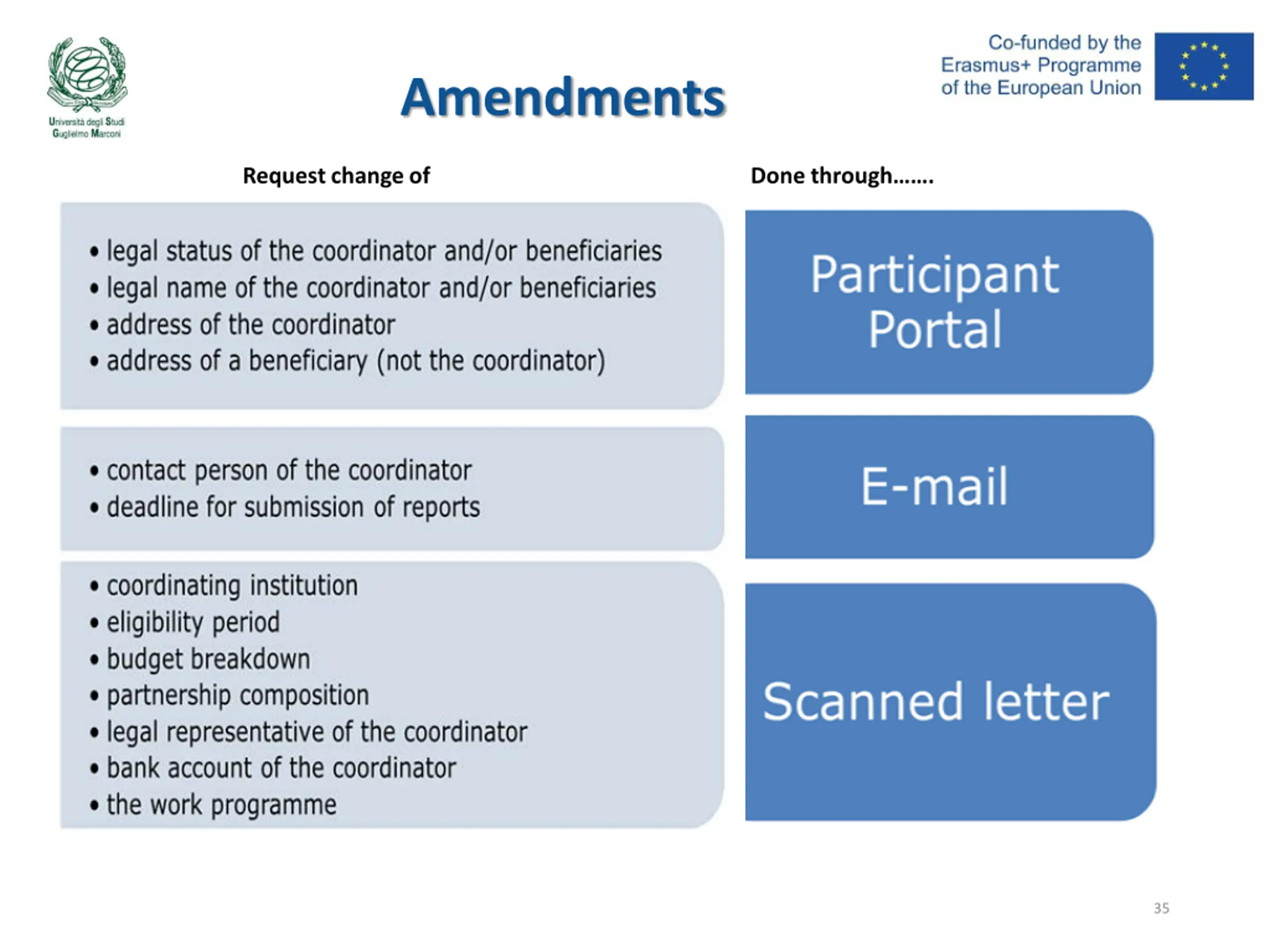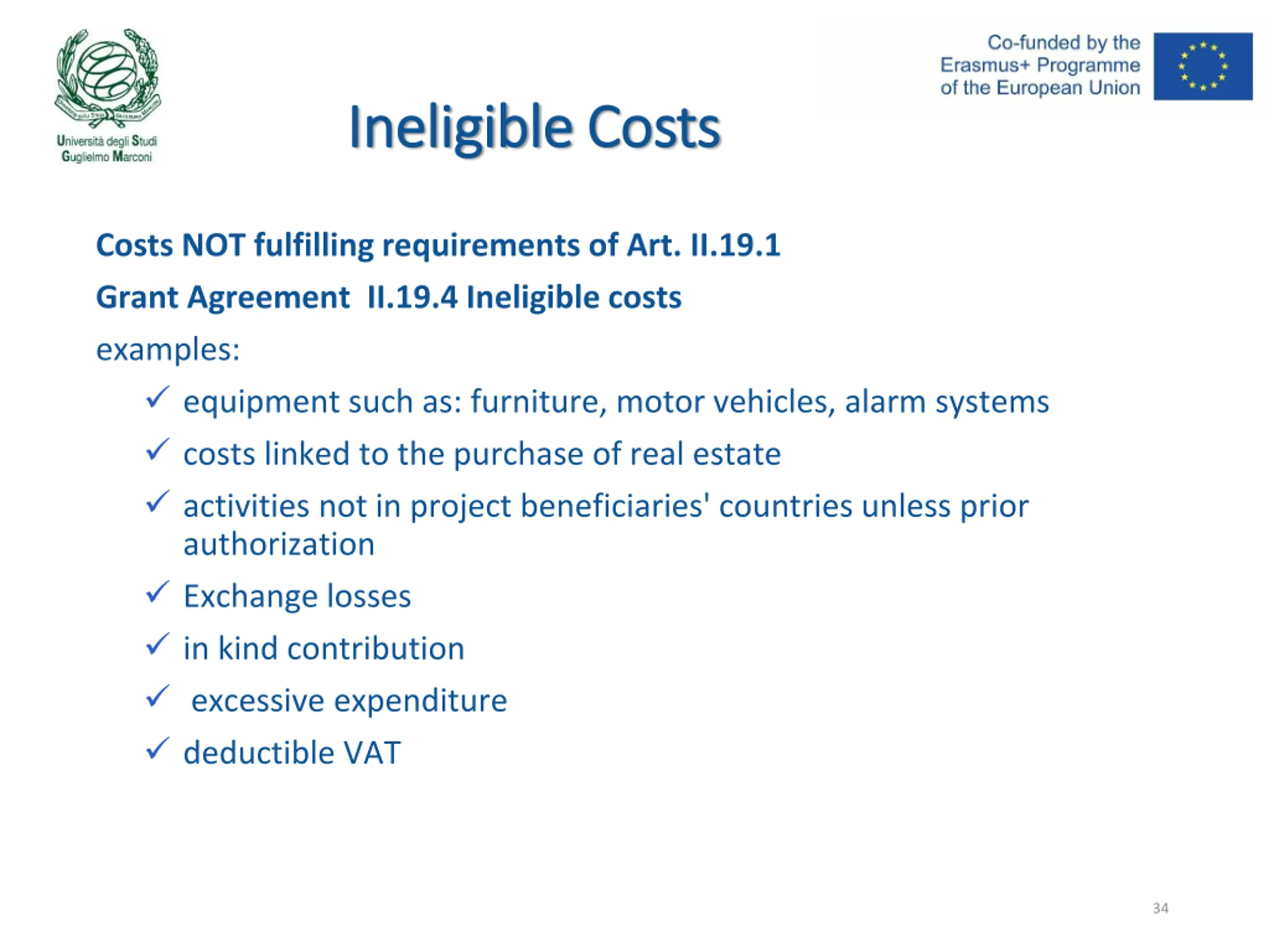 Ineligible Ineligible Costs Costs Costs NOT fulfilling requirements of Art. II.19.1 Grant Agreement II.19.4 Ineligible costs examples: equipment such as: furniture, motor vehicles, alarm systems costs linked to the purchase of real estate activities not in project beneficiaries' countries unless prior authorization Exchange losses in kind contribution excessive expenditure deductible VAT 34