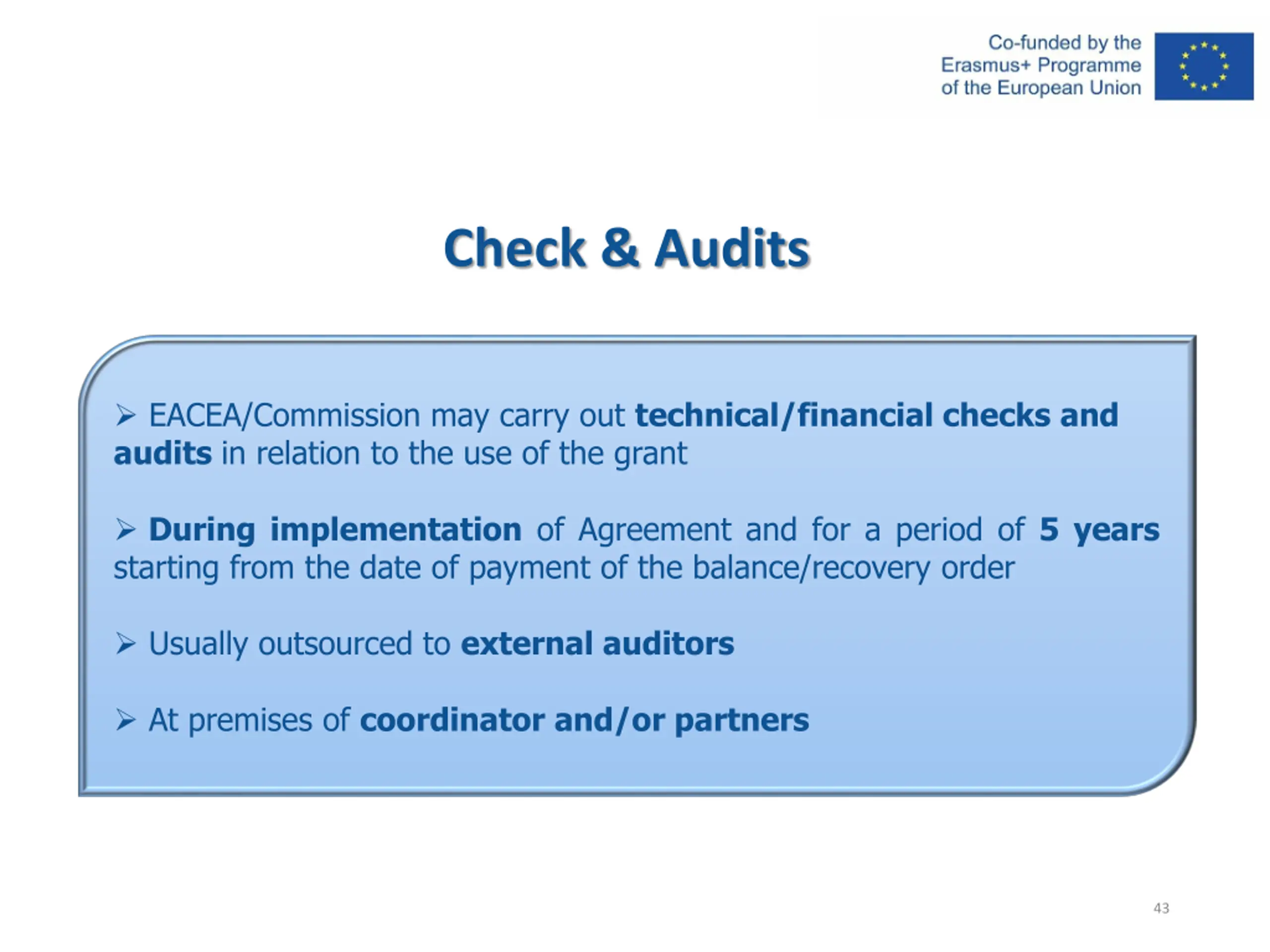 Check & Audits EACEA/Commission may carry out technical/financial checks and audits in relation to the use of the grant During implementation of Agreement and for a period of 5 years starting from the date of payment of the balance/recovery order Usually outsourced to external auditors At premises of coordinator and/or partners 43