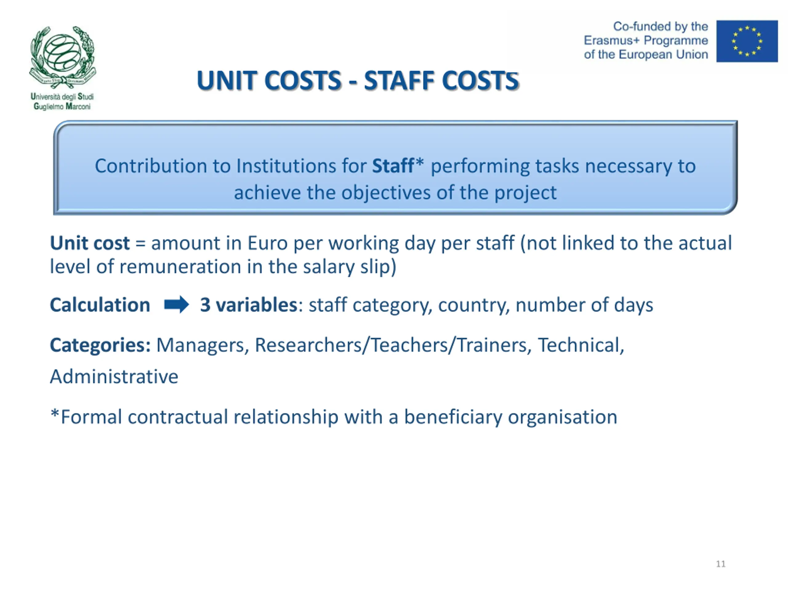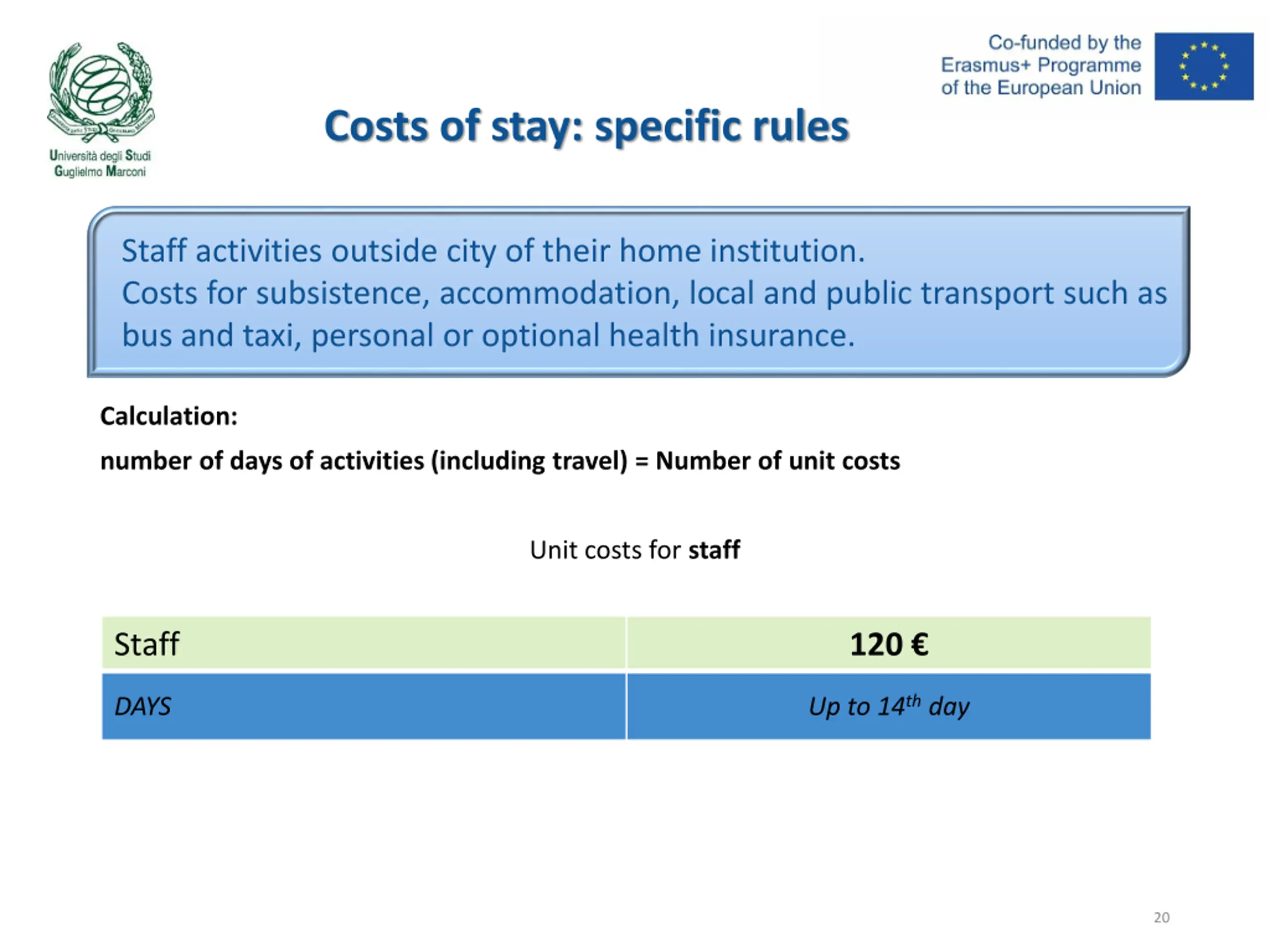 Costs of stay: specific rules Staff activities outside city of their home institution. Costs for subsistence, accommodation, local and public transport such as bus and taxi, personal or optional health insurance. Calculation: number of days of activities (including travel) = Number of unit costs Unit costs for staff Staff 120 Up to 14thday DAYS 20