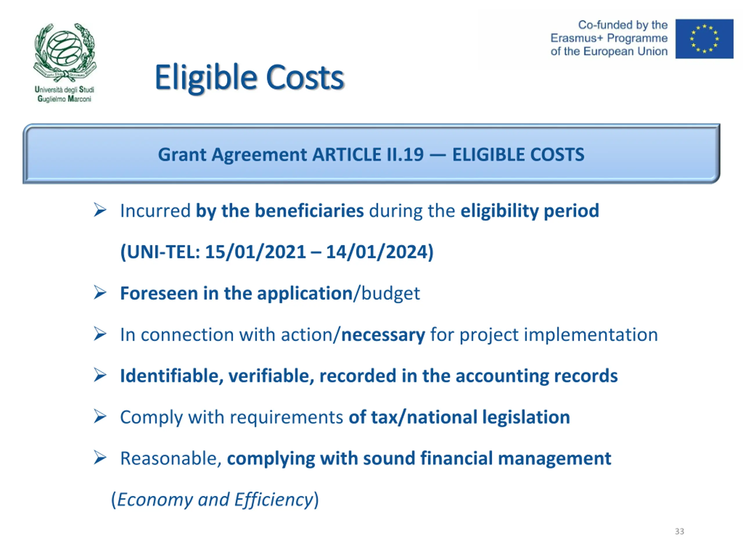 Eligible Eligible Costs Costs Grant Agreement ARTICLE II.19 ELIGIBLE COSTS Incurred by the beneficiaries during the eligibility period (UNI-TEL: 15/01/2021 14/01/2024) Foreseen in the application/budget In connection with action/necessary for project implementation Identifiable, verifiable, recorded in the accounting records Comply with requirements of tax/national legislation Reasonable, complying with sound financial management (Economy and Efficiency) 33