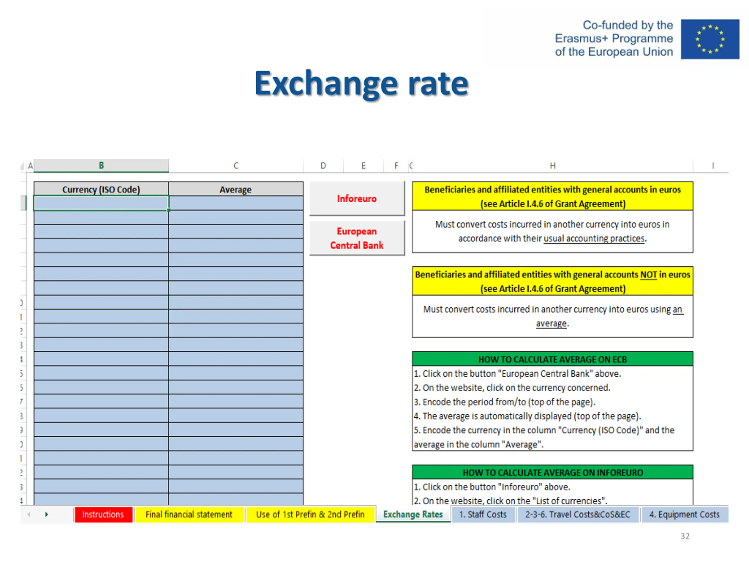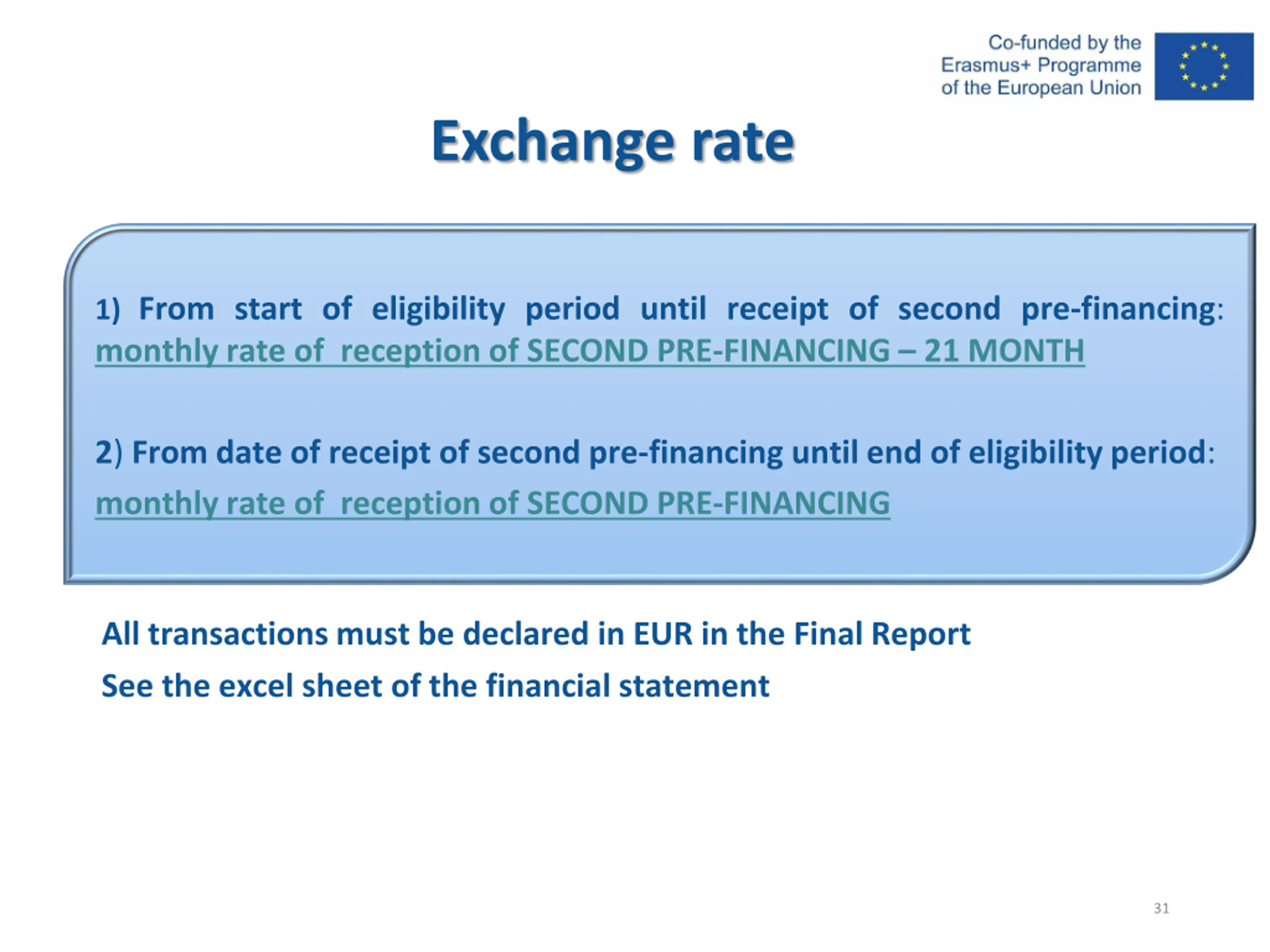 Exchange rate 1) From start of eligibility period until receipt of second pre-financing: monthly rate of reception of SECOND PRE-FINANCING 21 MONTH 2) From date of receipt of second pre-financing until end of eligibility period: monthly rate of reception of SECOND PRE-FINANCING All transactions must be declared in EUR in the Final Report See the excel sheet of the financial statement 31
